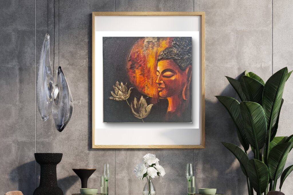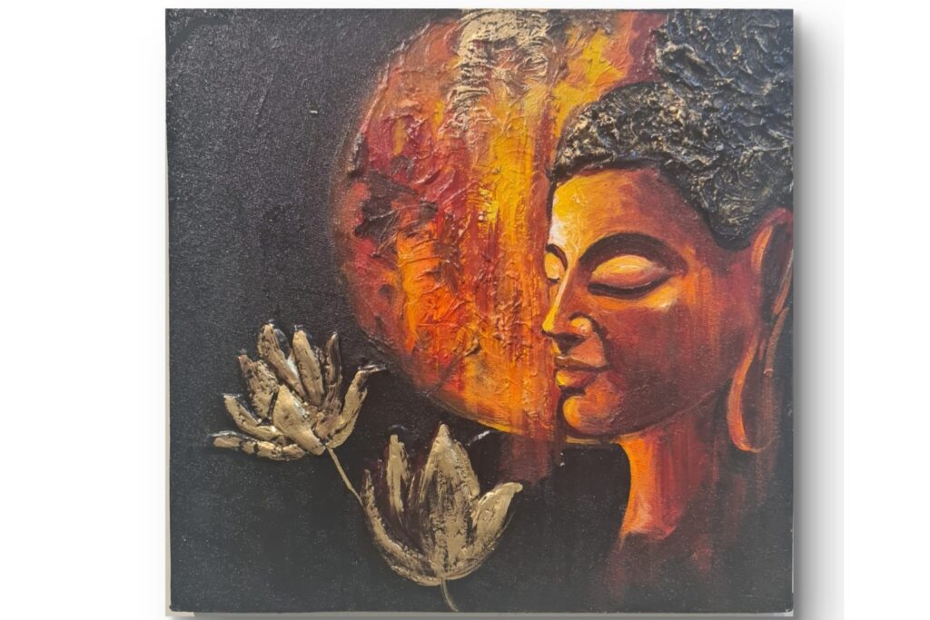 An abstract acrylic painting of Buddha surrounded by a radiant halo and golden lotuses — symbolizing peace, purity, and spiritual enlightenment.