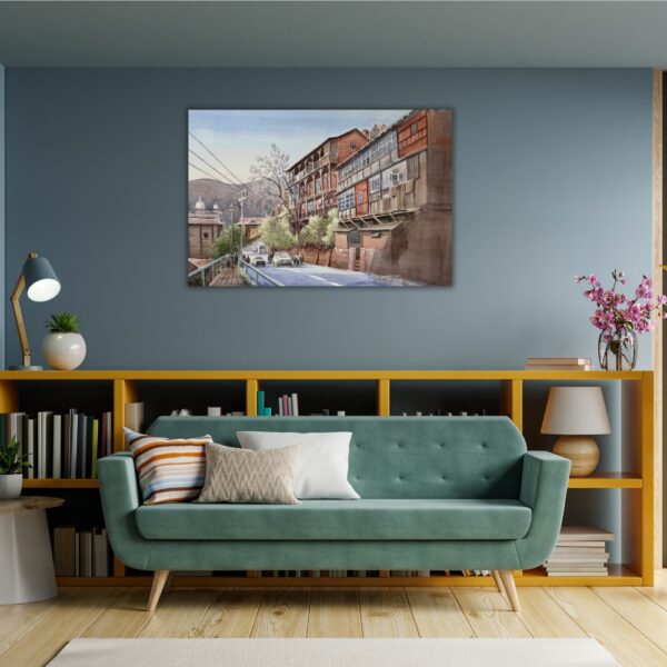 Watercolor painting of a street lined with traditional wooden houses by Jasvir Ram