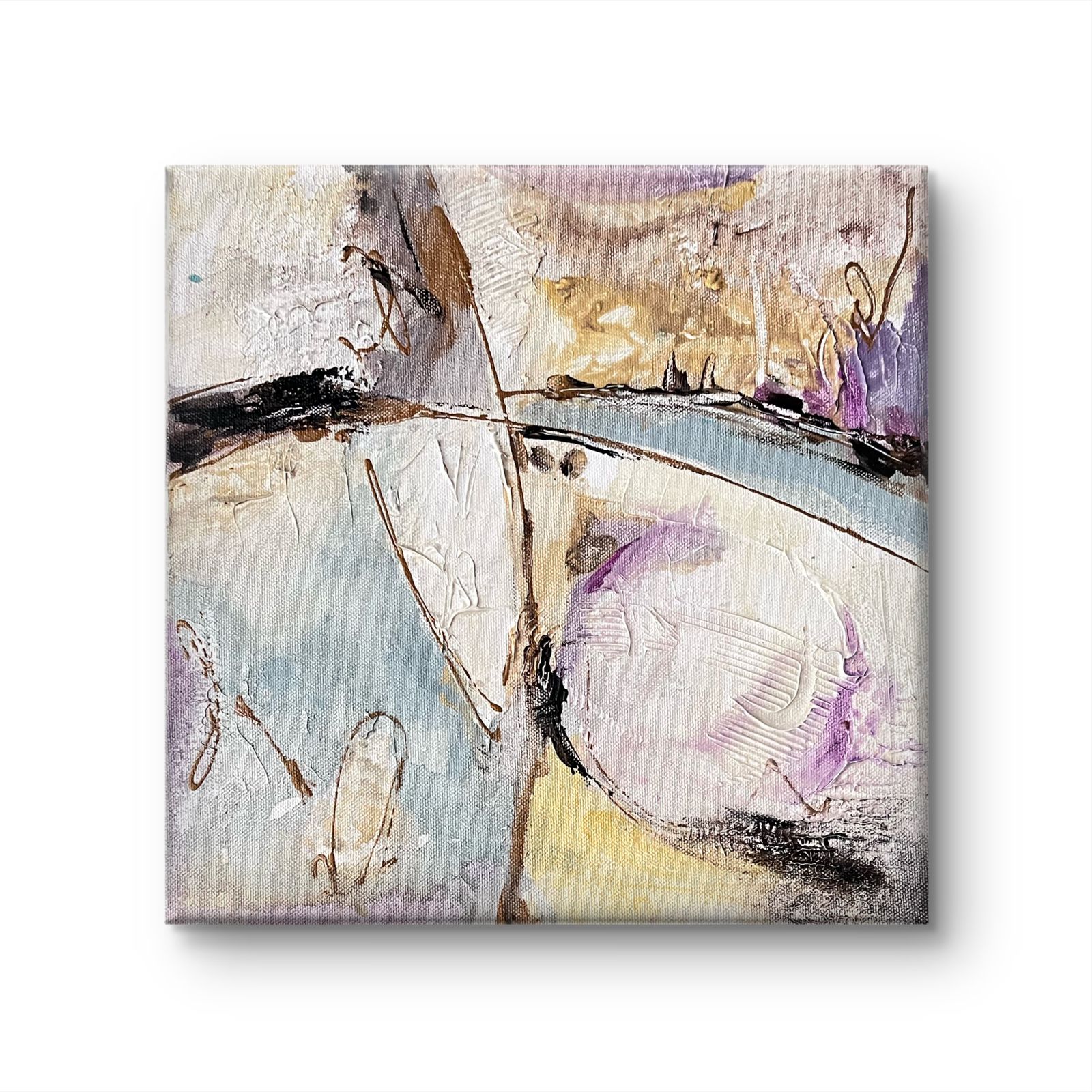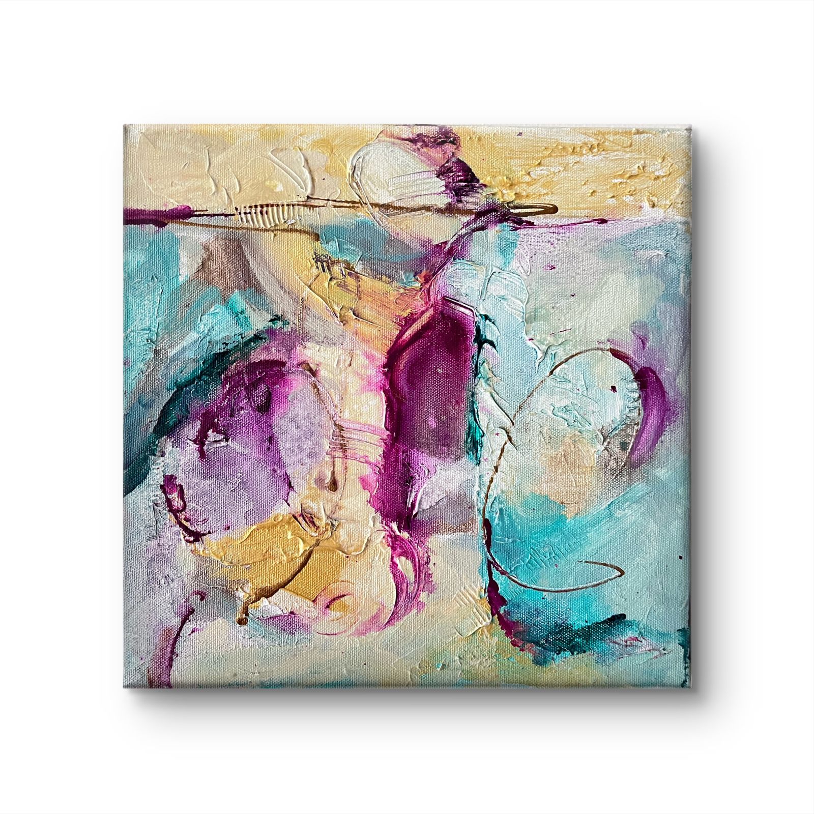 A dynamic 12×12 inch abstract artwork featuring textured layers, sweeping strokes, and a harmonious blend of turquoise, beige, purple, and magenta.