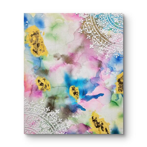 Acrylic painting “Soul’s Liberation” featuring a radiant golden lotus and symbolic seeds representing life forms on their spiritual journey toward enlightenment and inner peace.