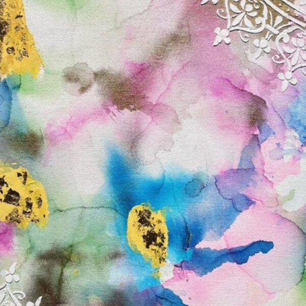 A dynamic 12×12 inch abstract artwork featuring textured layers, sweeping strokes, and a harmonious blend of turquoise, beige, purple, and magenta.
