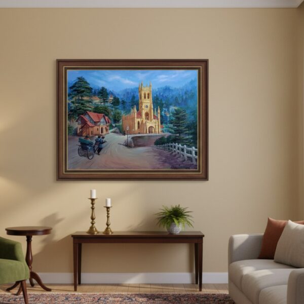 Clock tower and lush hills in Shimla street view painting by Jasvir Ram