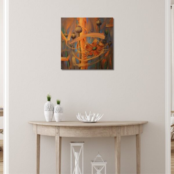 Whispers of Autumn Bloom painting by Jagjit Singh – abstract floral artwork with orange blossom and golden brushstrokes on canvas.