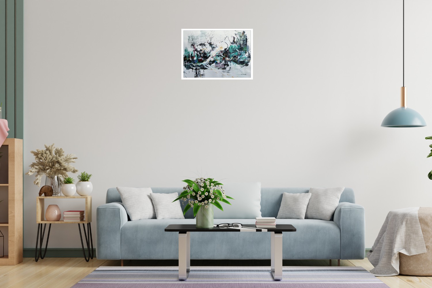 Layered textures, hints of gold and black, and dynamic brushwork create depth and movement, evoking both serenity and vitality. Measuring 28 × 14 inches, this original painting makes a striking focal point for any modern or contemporary space.