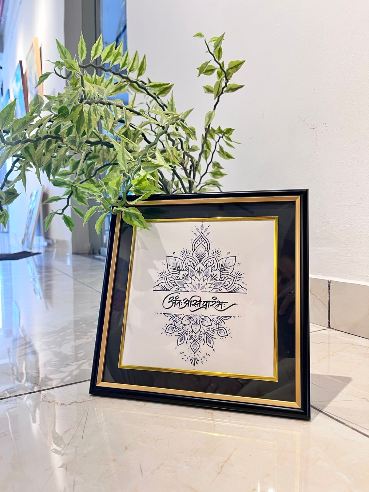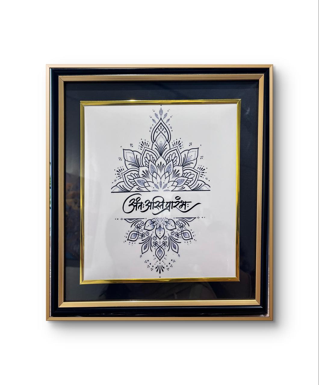 Antah Asti Prarambh — translating to “The End is the Beginning” — is a profound Sanskrit artwork symbolizing the eternal cycle of endings and new beginnings. The design is rendered in elegant black ink on a crisp white background, featuring the sacred phrase at the center surrounded by a meticulously detailed mandala-inspired pattern. The floral and geometric motifs radiate in perfect symmetry, representing balance, continuity, and renewal. Enclosed in a refined black and gold double frame, this piece blends minimalism with spiritual sophistication, inspiring calm reflection and timeless wisdom in any space.