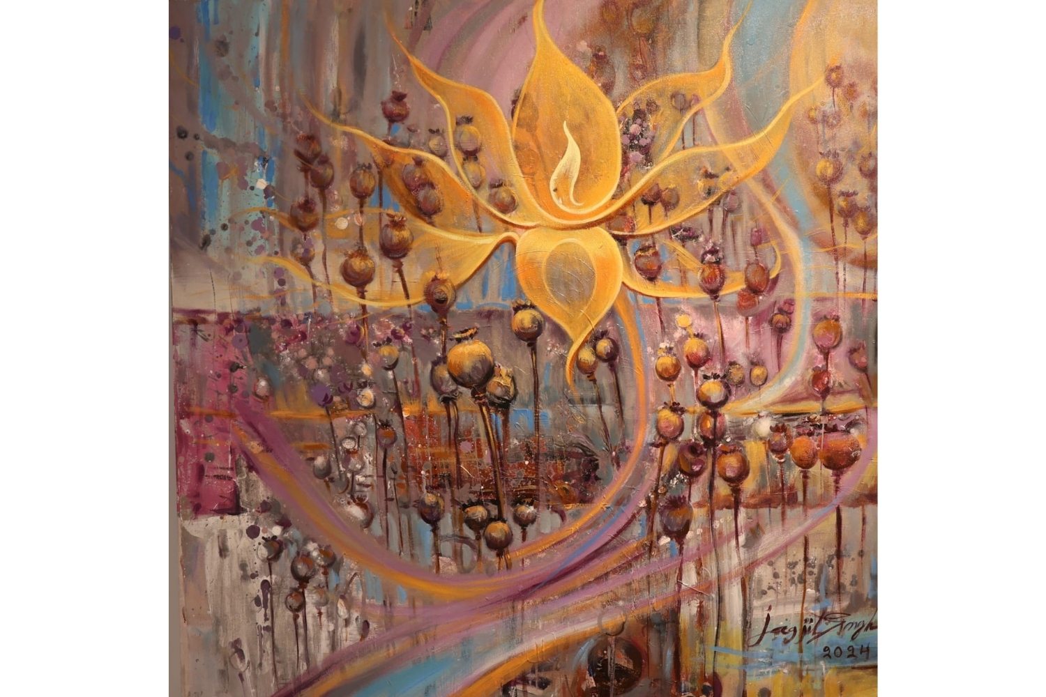 Awakening Light is a radiant abstract painting that symbolizes spiritual awakening and the eternal cycle of life. At the center, a golden lotus glows with a flame of consciousness, representing purity, enlightenment, and transcendence. Surrounding seed-like motifs and flowing strokes of purple, pink, and blue create a harmonious rhythm of energy, growth, and renewal.