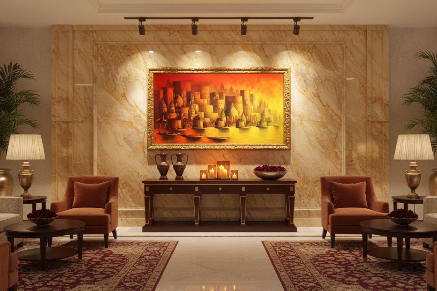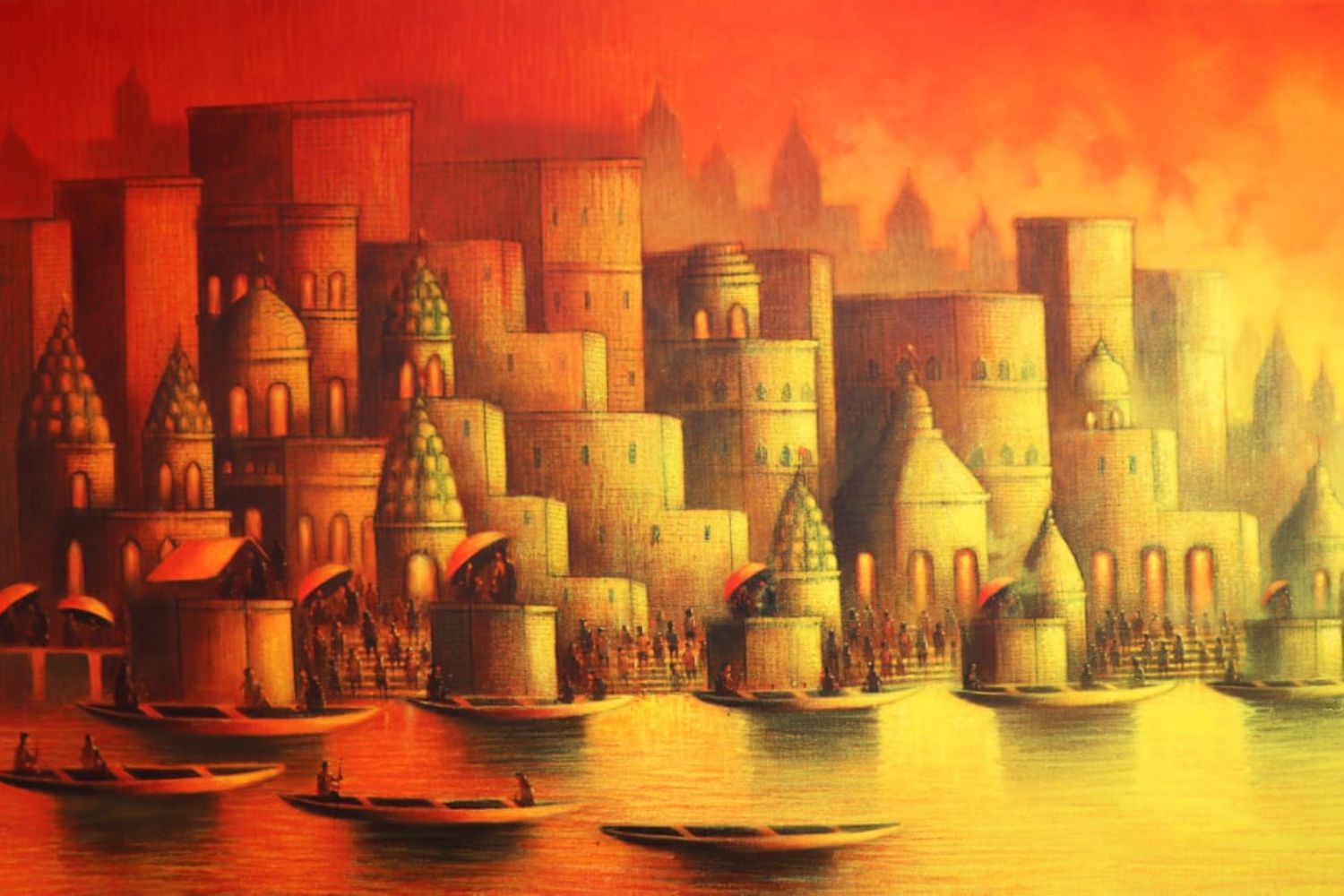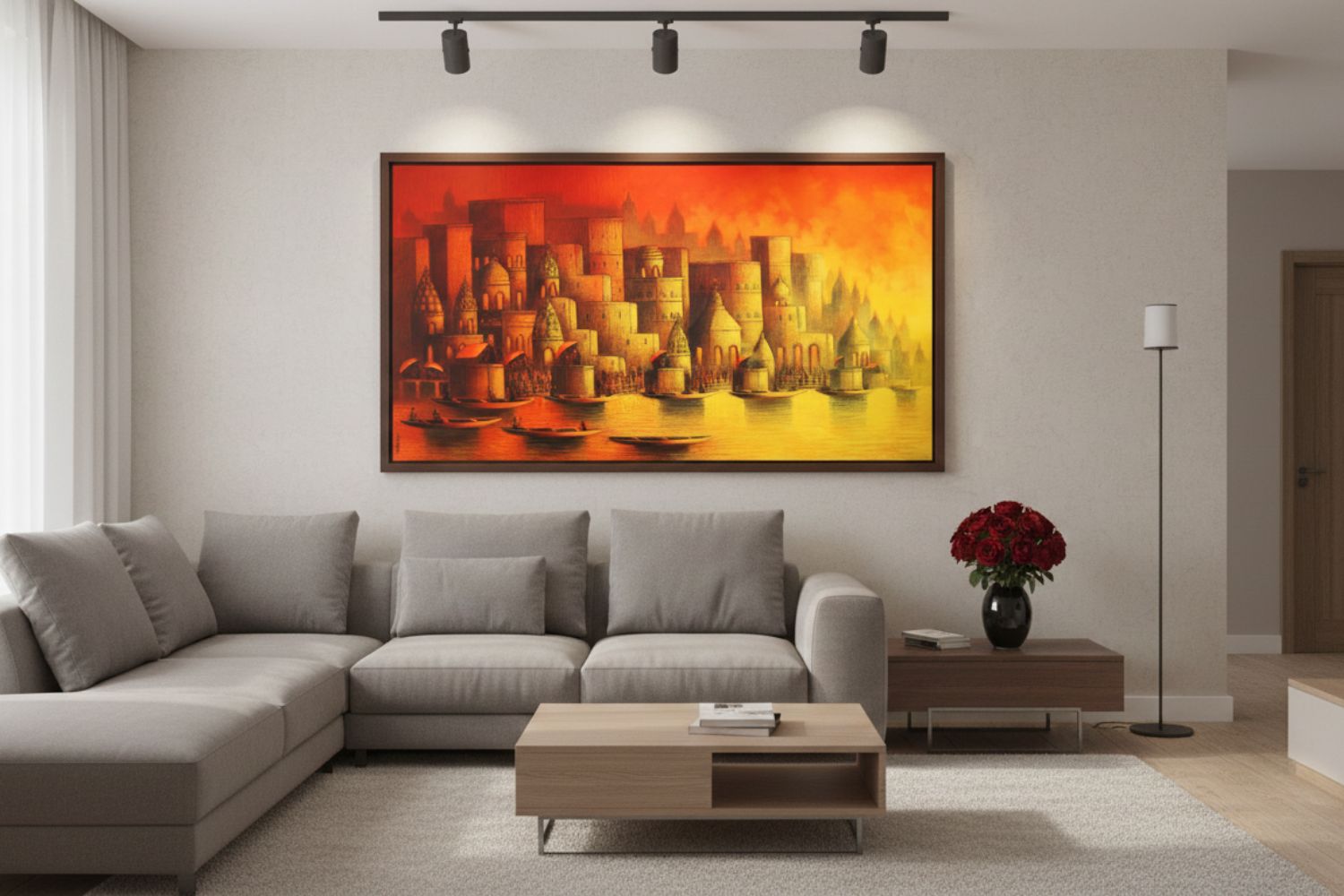 Banaras ghats painting, Varanasi artwork, fire and water balance painting, spiritual wall art India, Ganga river painting, Vastu auspicious artwork, 72×40 canvas painting, luxury spiritual art