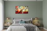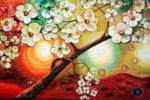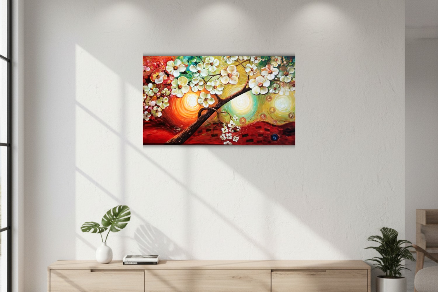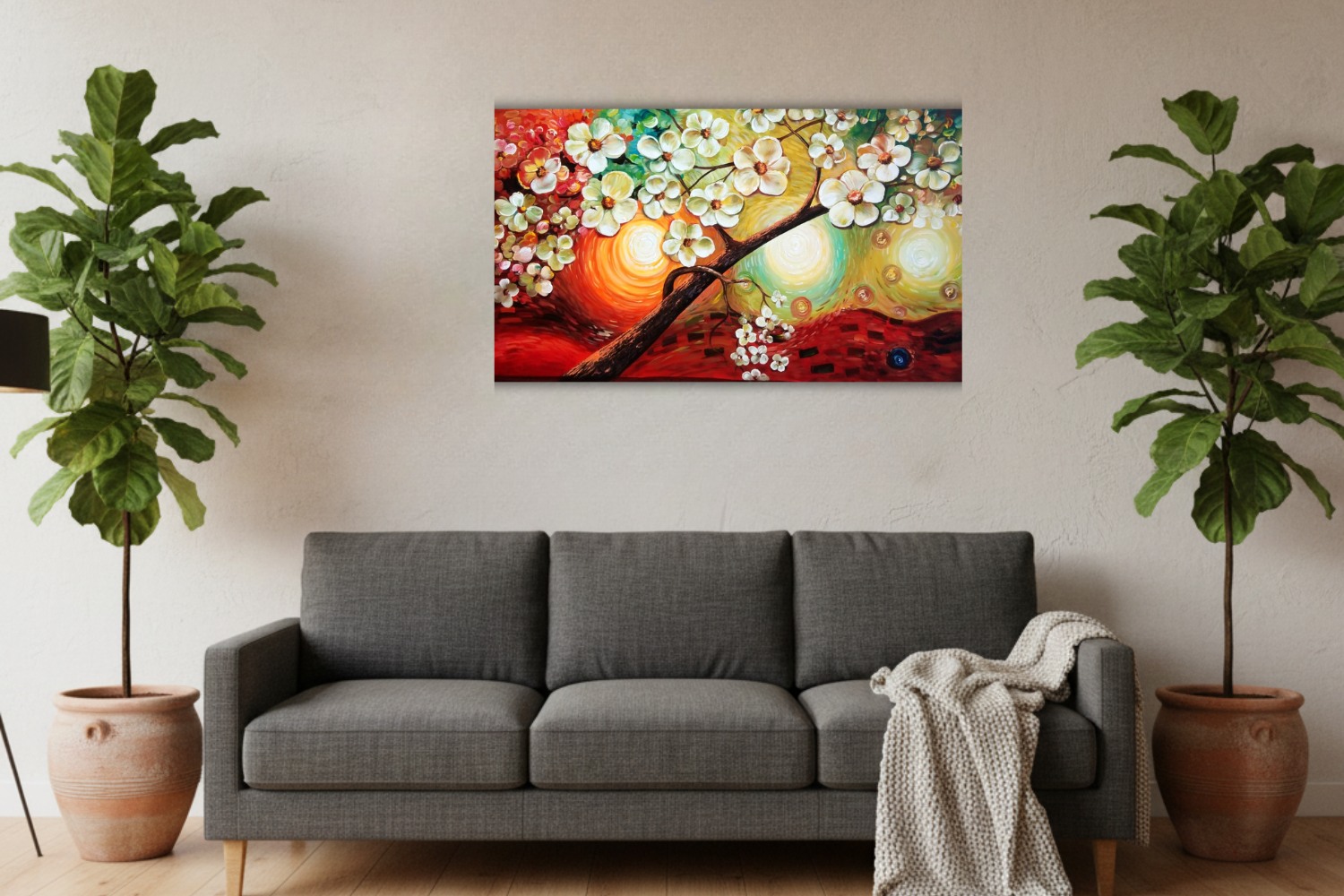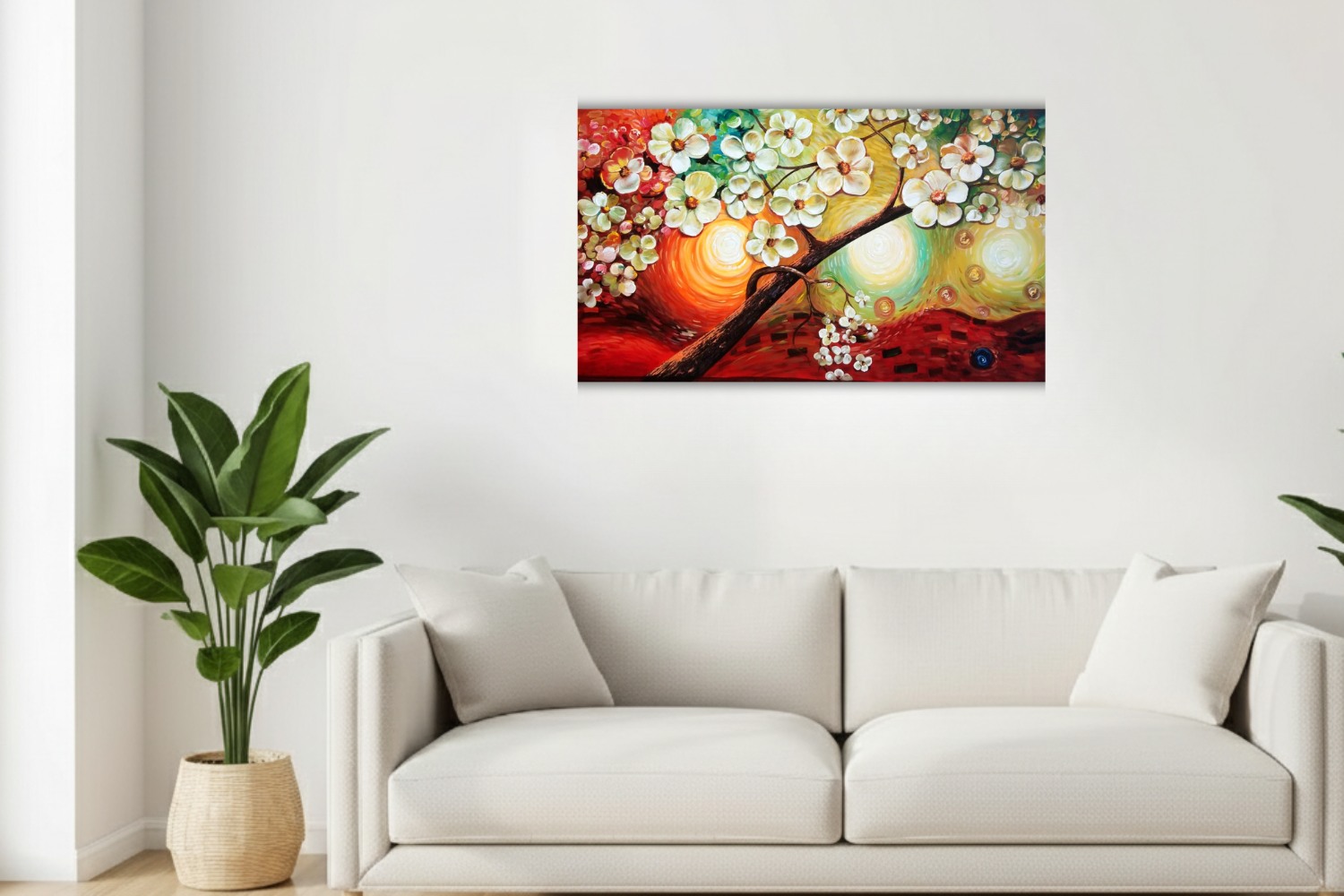 Blossoms of Radiance is a mesmerizing painting that celebrates nature’s vibrancy and renewal. A blossoming tree branch adorned with delicate white flowers stretches across a swirling background of rich reds, oranges, yellows, and calming greens. The glowing orbs in the backdrop resemble sunlight filtering through foliage, infusing the composition with warmth and energy. This artwork symbolizes hope, growth, and the radiant beauty of life in full bloom — a perfect blend of elegance and positivity.