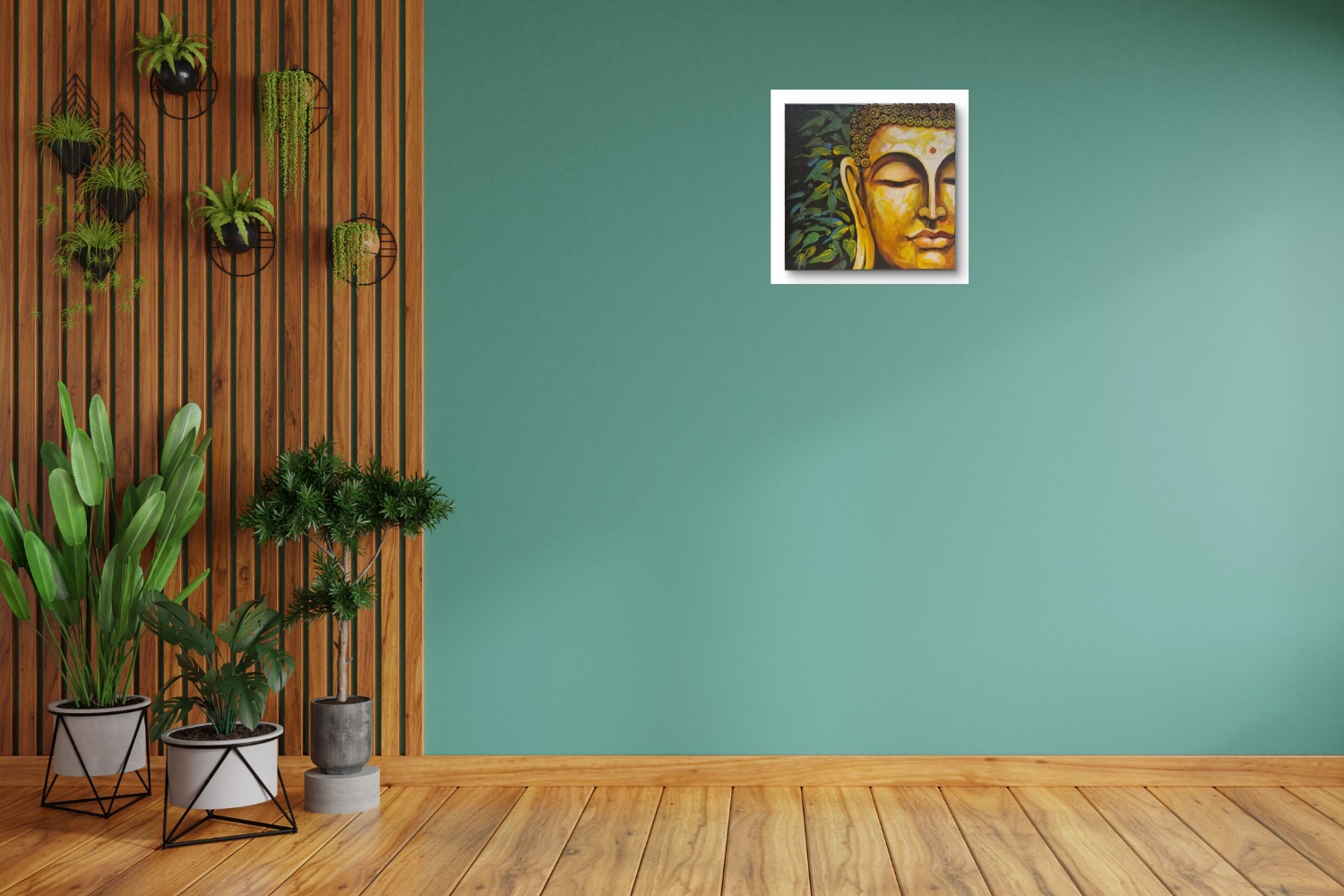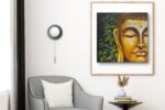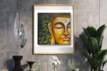 This serene abstract painting of Buddha’s face embodies peace, mindfulness, and enlightenment. Rendered in warm golden and earthy tones, the artwork captures the essence of inner calm. The half-portrait composition, with closed eyes and gentle contours, symbolizes spiritual awakening. Textured curls and delicate gradients add depth, while hints of green and blue foliage in the background represent harmony with nature. A perfect piece to bring balance, positivity, and meditation energy into any space.