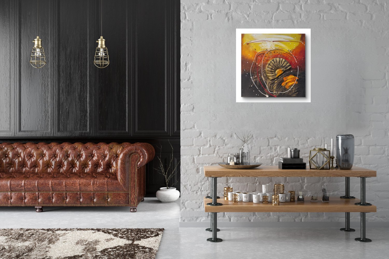 Cosmic Currents is an expressive abstract painting that captures the flow of cosmic energy through vivid color and texture. The composition radiates with swirling tones of gold, crimson, and amber, contrasted by deep earthy shades and luminous highlights. The dynamic brushwork and layered forms evoke the movement of celestial forces, symbolizing creation, transformation, and balance within the universe.