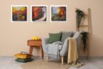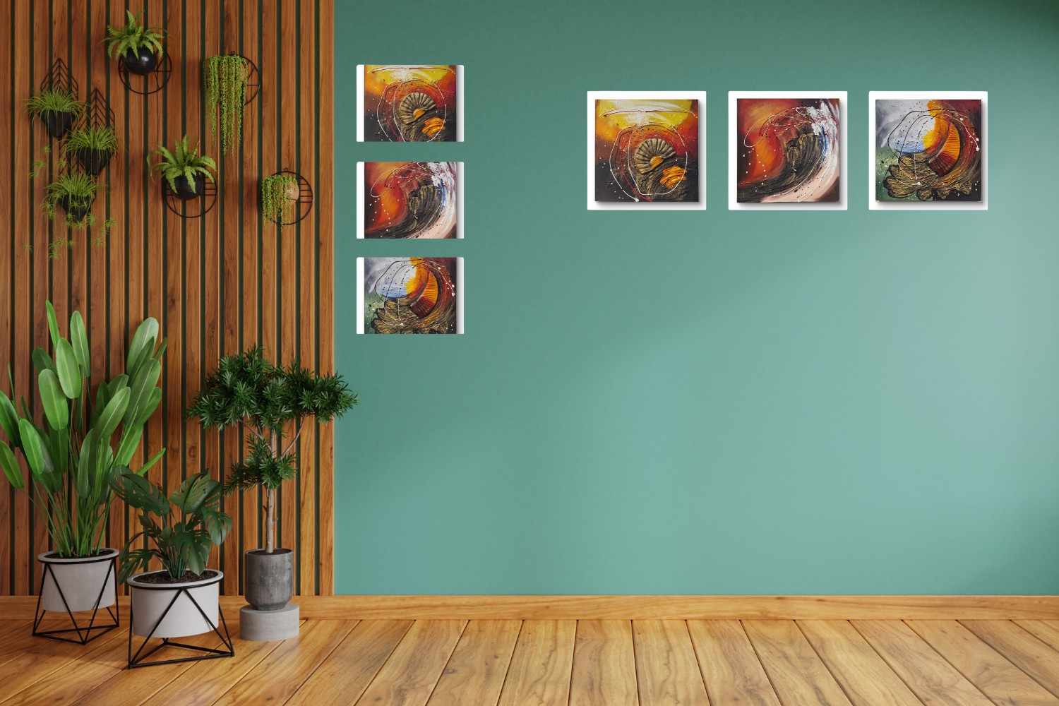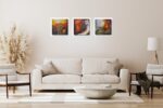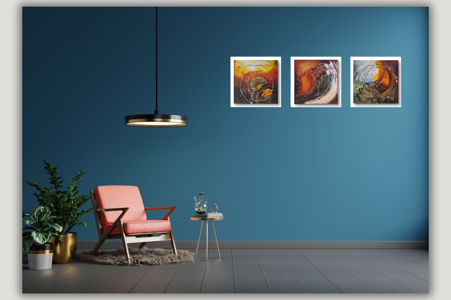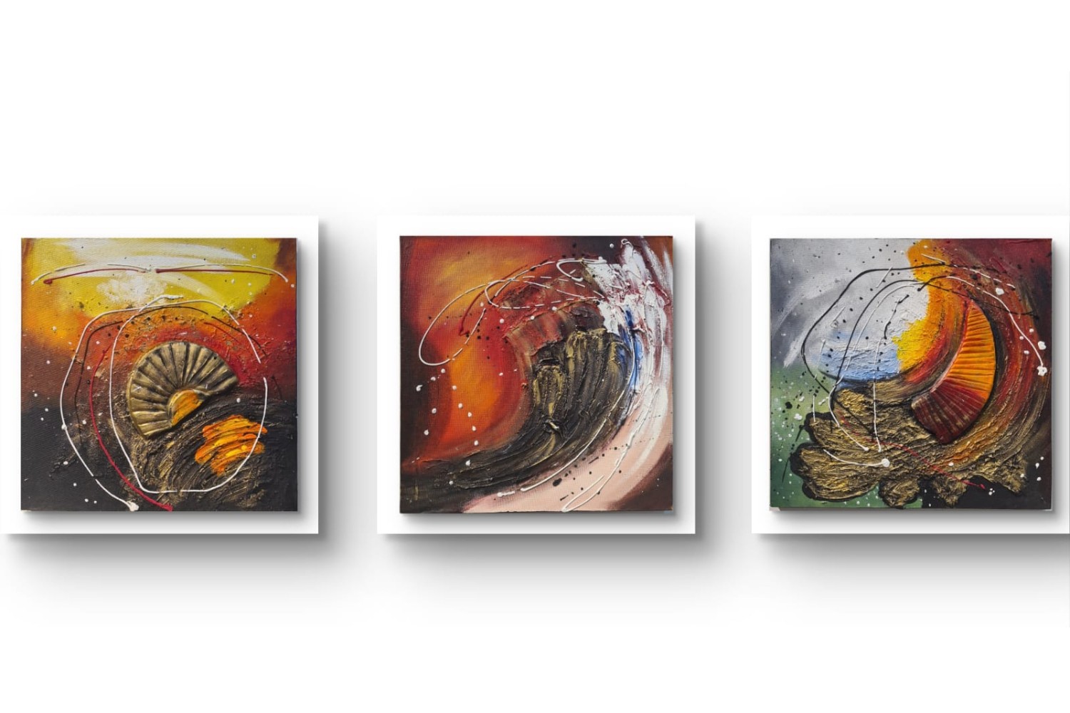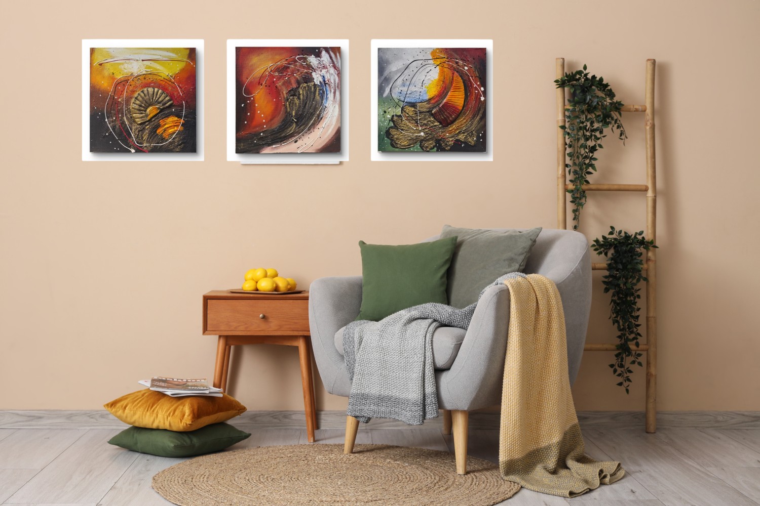 Cosmic Currents is an expressive abstract triptych that captures the flow of cosmic energy through vivid color and texture. Each panel radiates with swirling tones of gold, crimson, and amber, contrasted by deep earthy shades and luminous highlights. The dynamic brushwork and layered forms evoke the movement of celestial forces, symbolizing creation, transformation, and balance within the universe. This 3-piece set creates a harmonious visual rhythm — perfect for modern and artistic interiors.