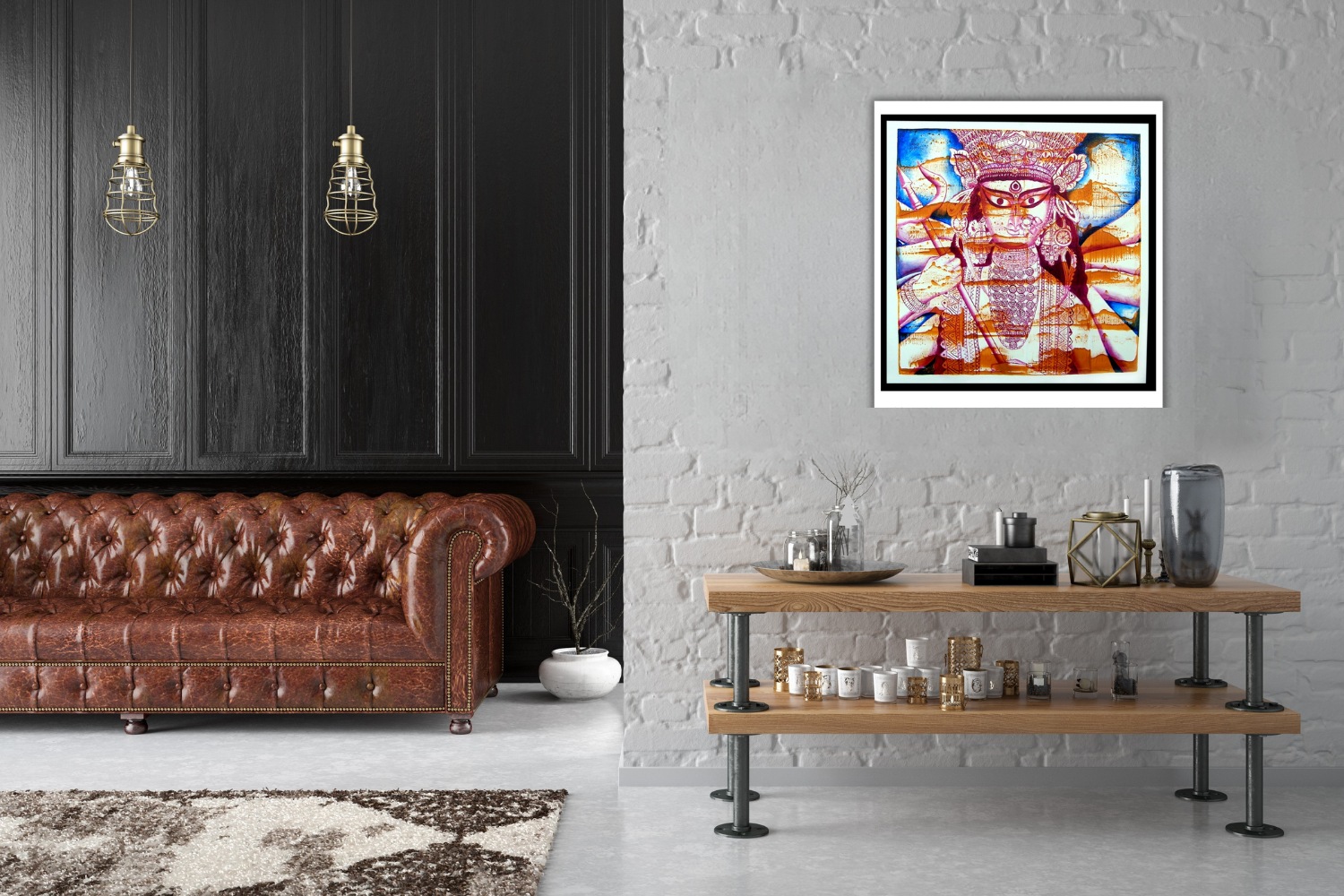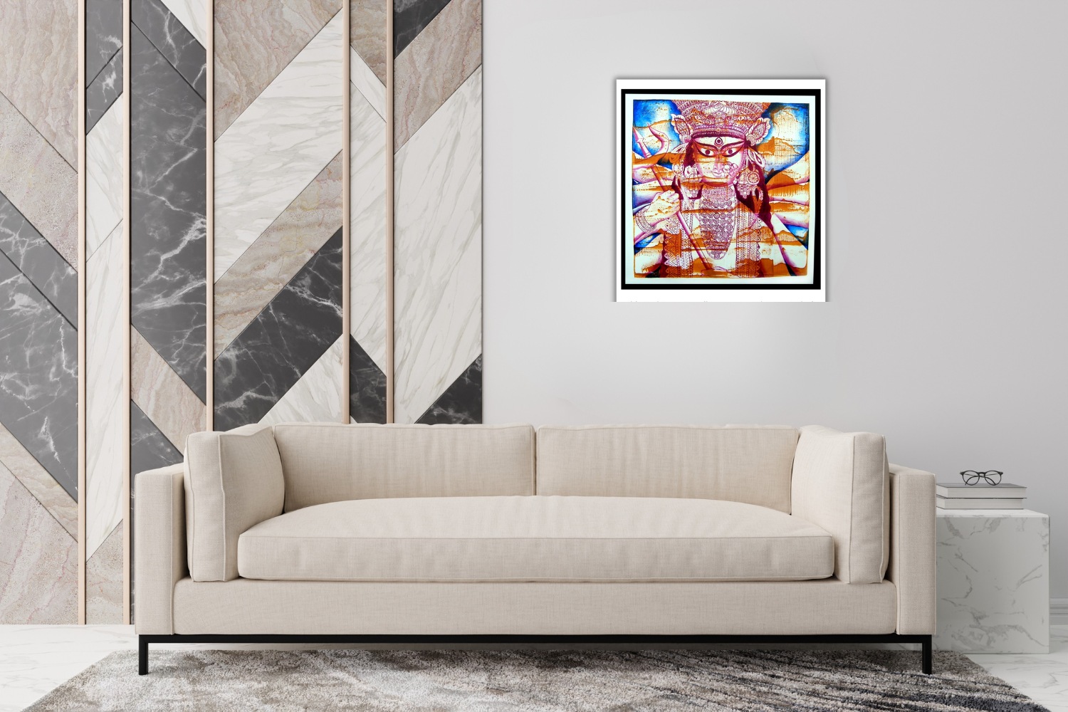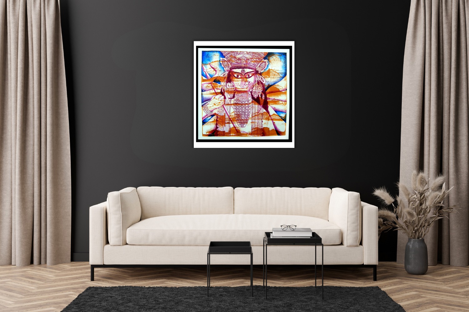 Bold hues of orange, red, purple, and blue convey intensity and devotion. Durga’s expressive eyes and serene yet fierce presence reflect her courage and divine authority. She is adorned with an intricate crown and jewelry, holding weapons including a trident (trishul), symbolizing the destruction of evil. The layered textures and abstract background add depth, movement, and contemporary appeal.