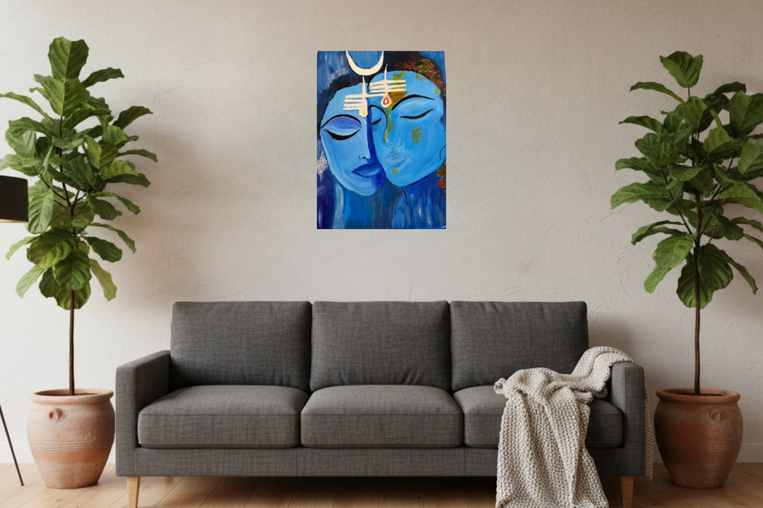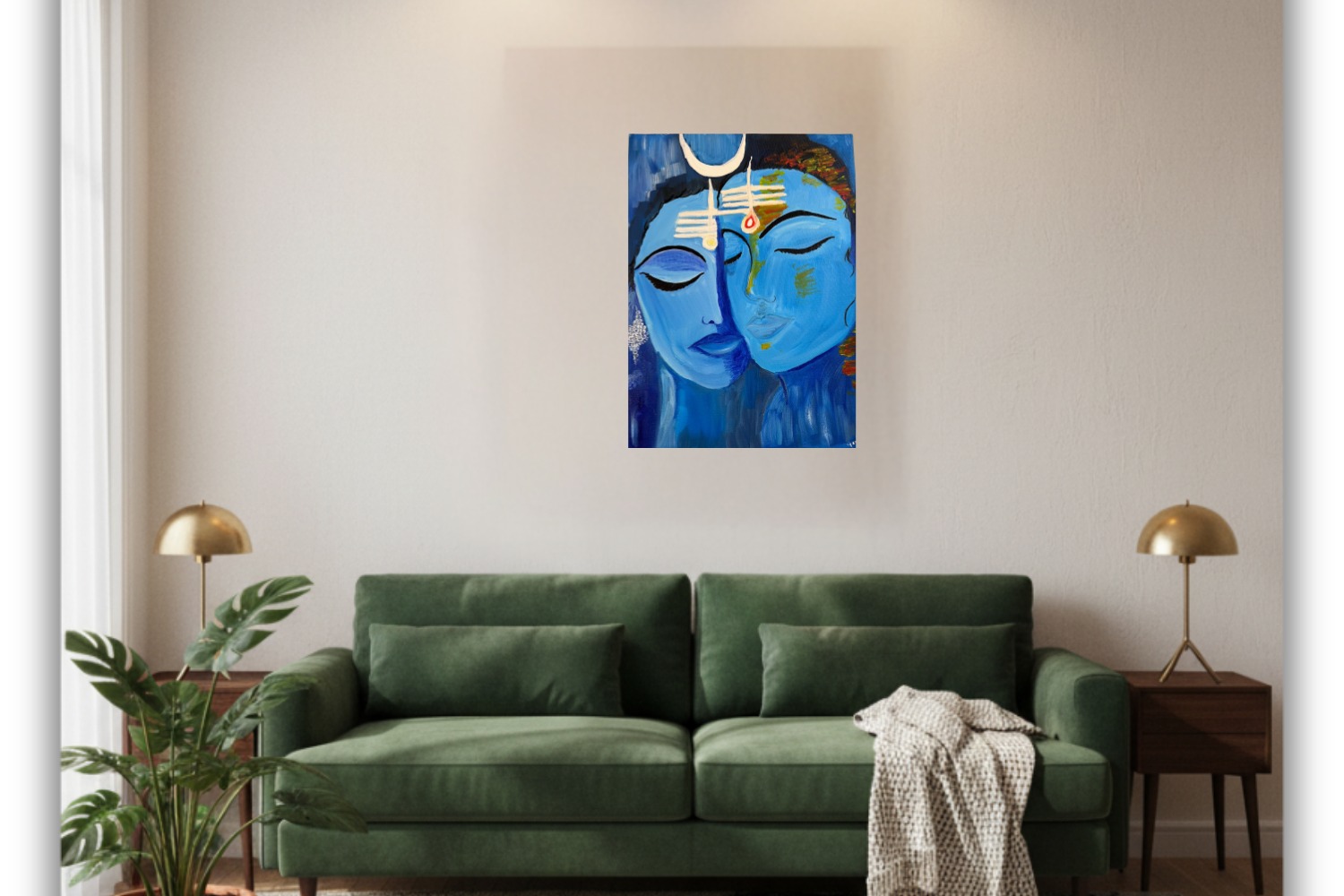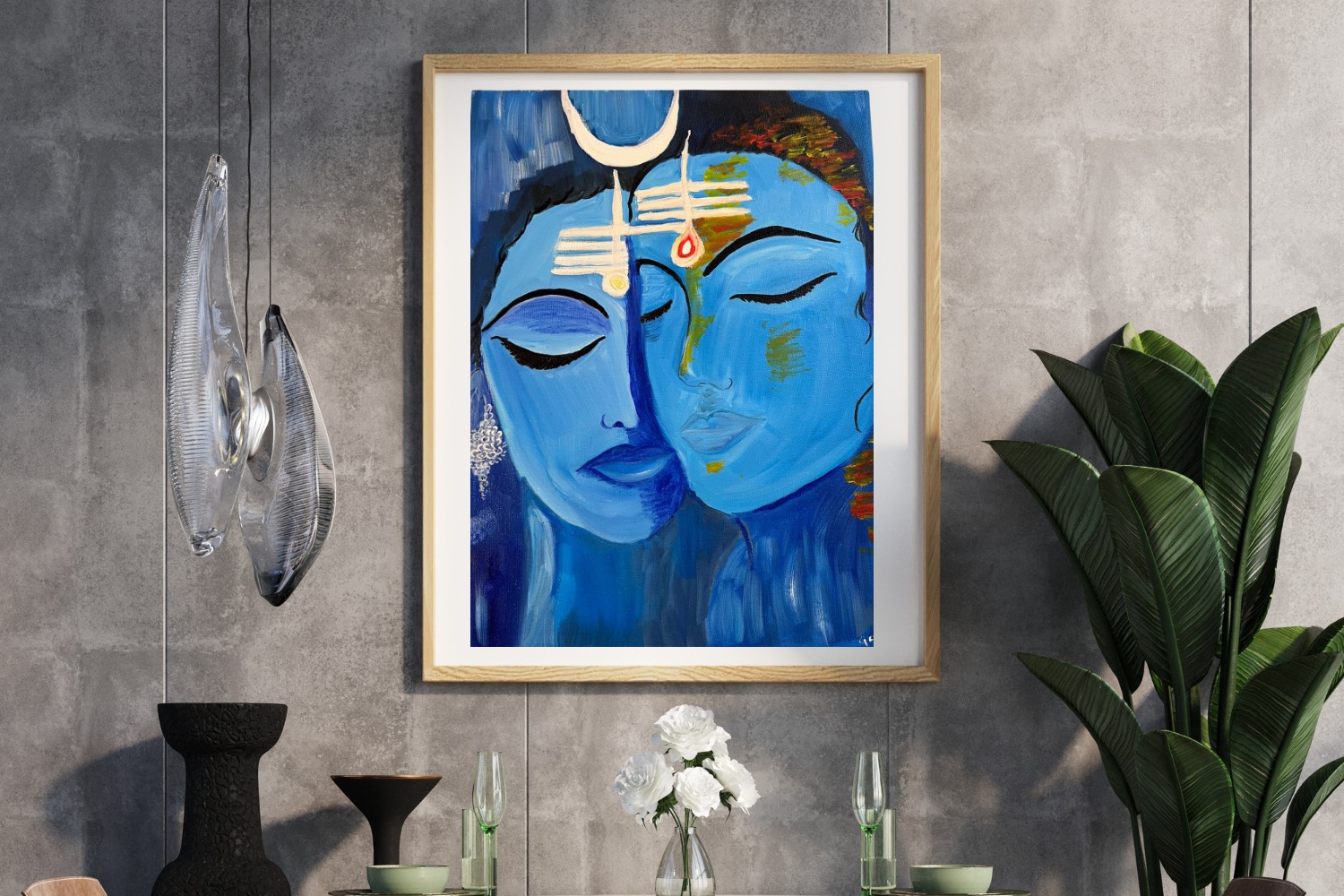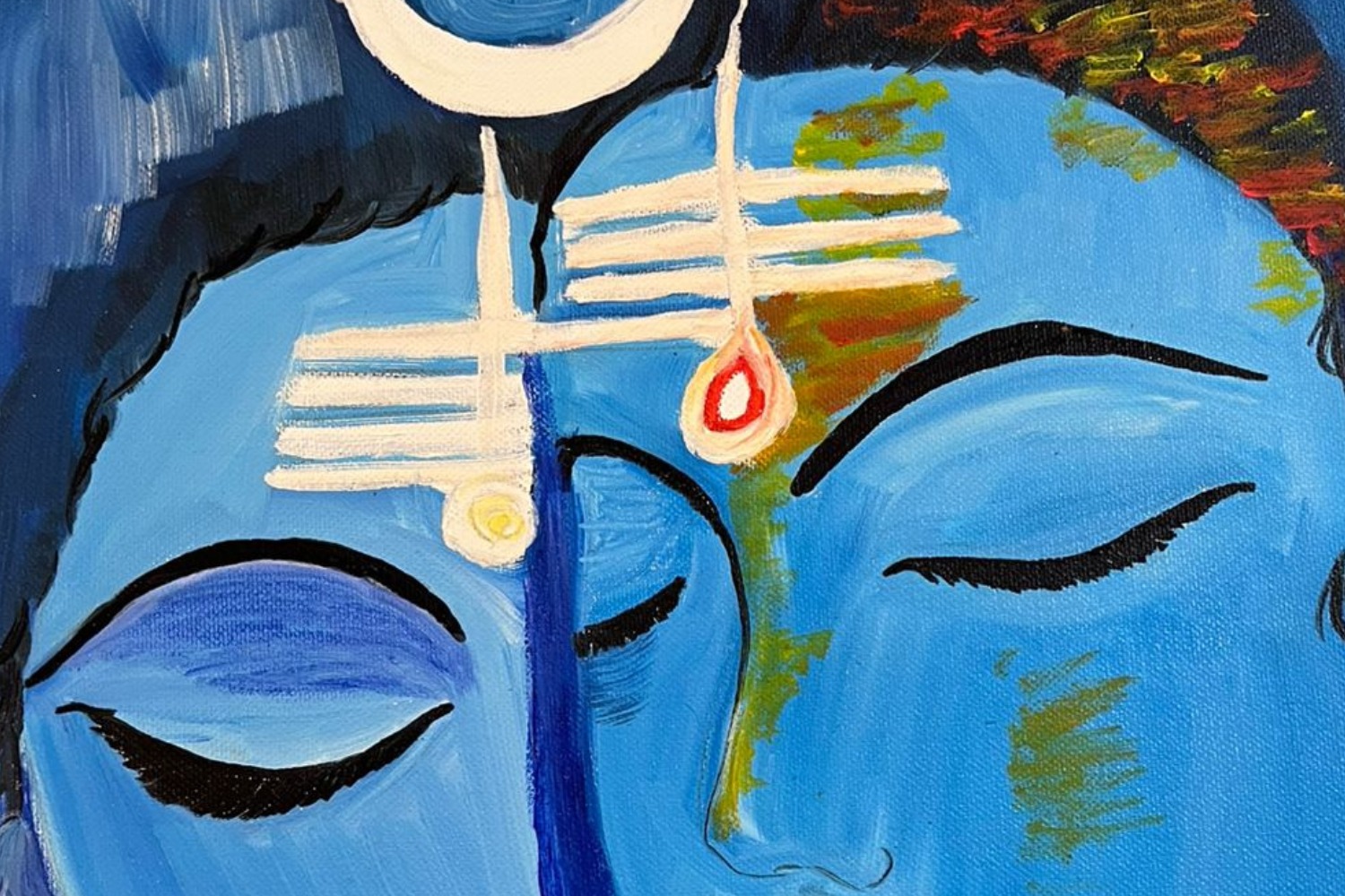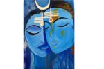 Divine Union – Shiva and Parvati portrays the eternal bond between Lord Shiva and Goddess Parvati, embodying the sacred harmony of masculine and feminine energies. Through soothing shades of blue and subtle detailing, the artist conveys peace, balance, and divine connection. The crescent moon on Shiva’s matted hair and Parvati’s gentle red bindi symbolize spiritual completeness and devotion. Their serene, intertwined faces represent love, unity, and the cosmic balance that sustains creation. This painting serves as a timeless reminder of divine oneness and the power of spiritual partnership.