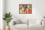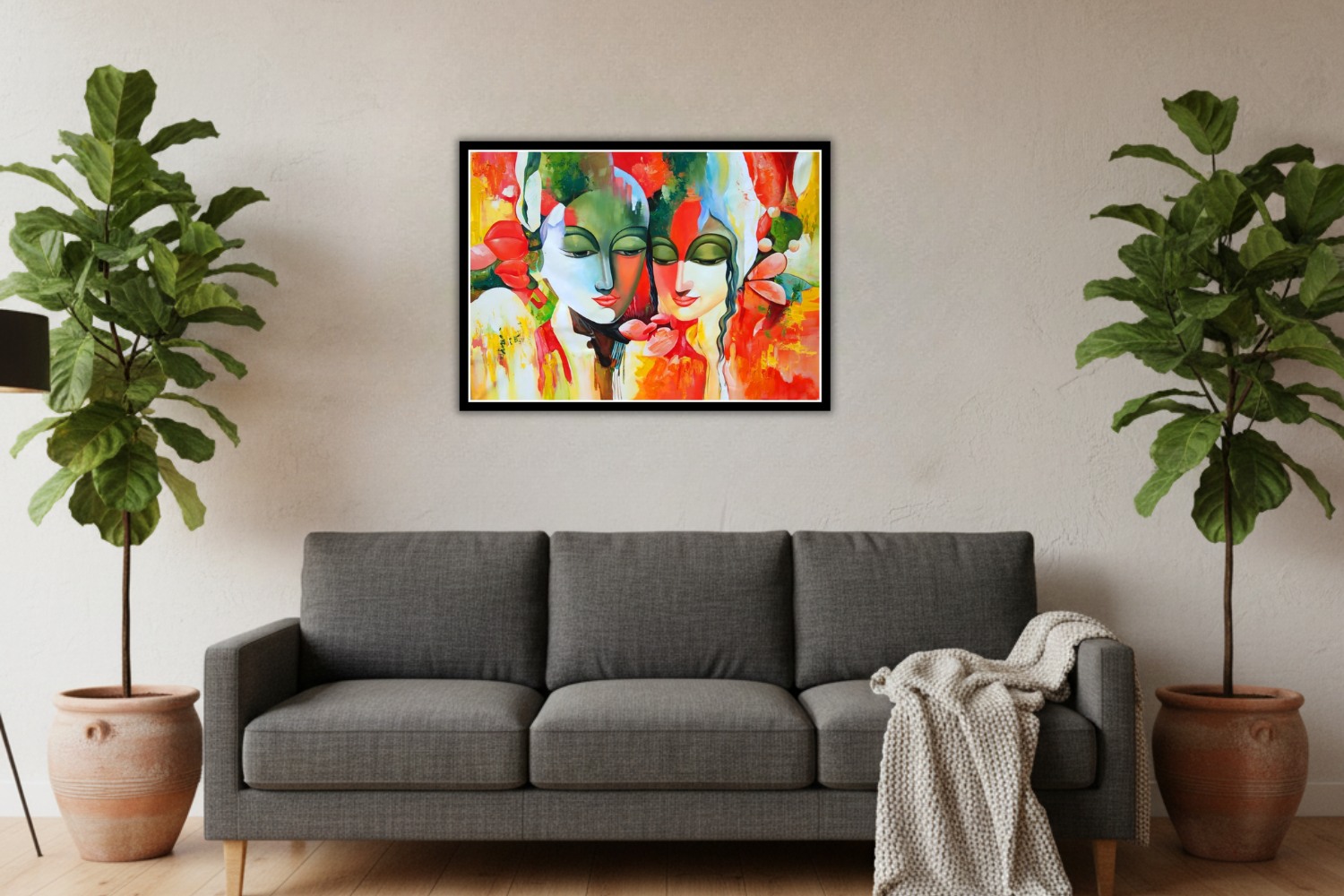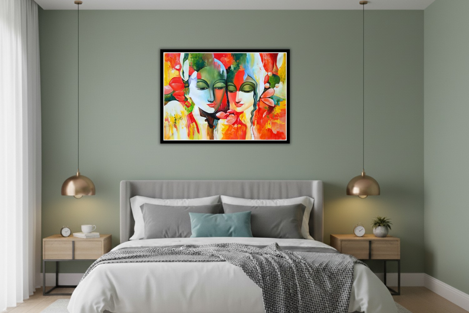 Eternal Harmony is a mesmerizing portrayal of divine love and spiritual unity. The painting features two serene figures whose gentle expressions and graceful forms symbolize the balance of masculine and feminine energies. The artist masterfully blends warm reds and yellows with cool greens and blues, creating a radiant harmony of color and emotion. The soft, flowing brushstrokes and abstract background lend a dreamlike quality, inviting the viewer into a world of peace, connection, and timeless devotion.