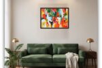 Fragments of Light and Time abstract lotus painting displayed above a modern bed in a stylish bedroom – Artzera Gallery wall art