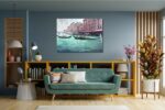 Glide Through Venetian Waters is a mesmerizing watercolor painting that beautifully captures the timeless charm of Venice. Gondolas glide gracefully across shimmering turquoise waters, steered with effortless elegance by gondoliers, while passengers relax and soak in the city’s historic canals.