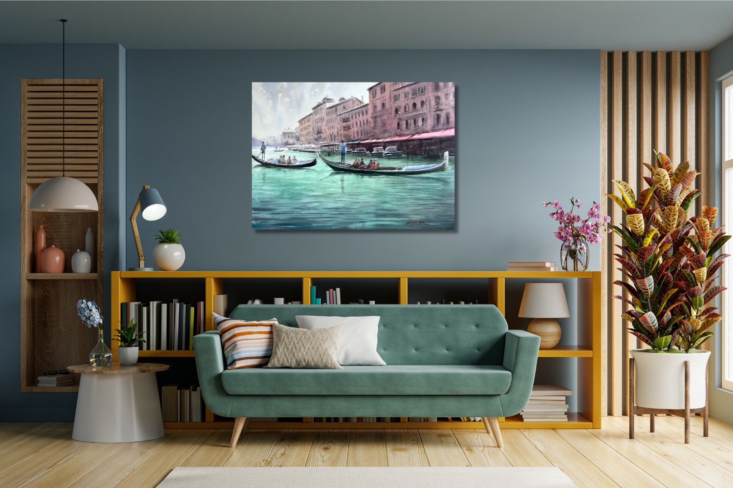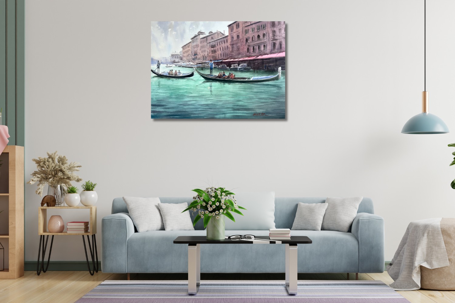 The backdrop showcases weathered Venetian buildings with ornate balconies and rustic facades, overlooking the lively waterway. With its harmonious balance of detail and atmosphere, this artwork radiates serenity, romance, and vibrant energy—an ode to the rhythm of life in Venice.
