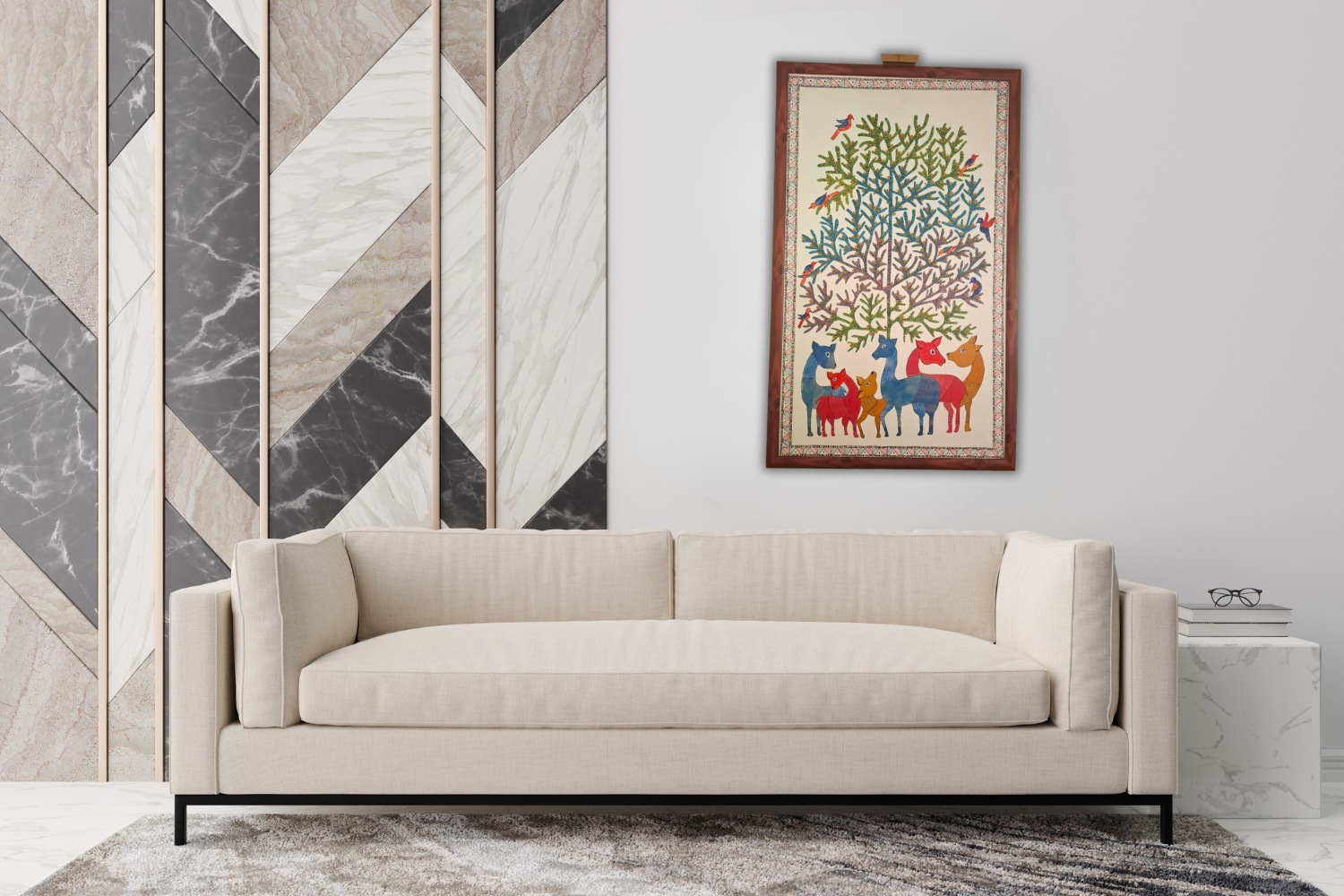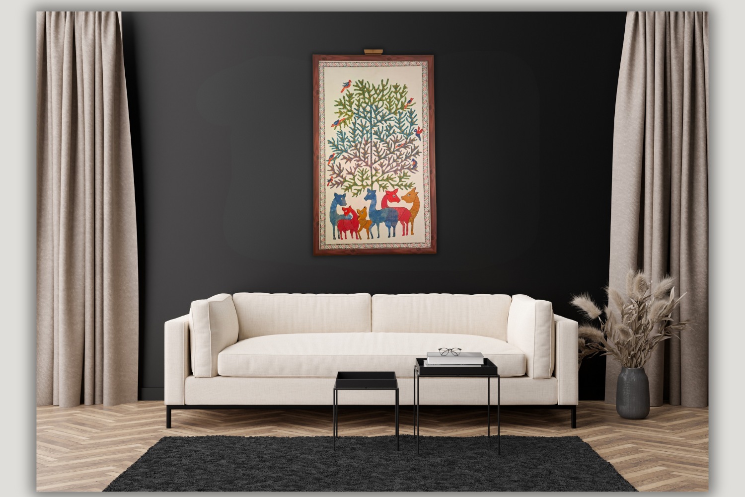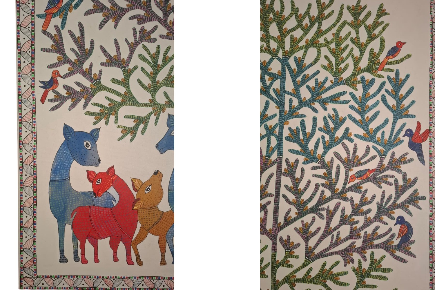 Authentic Gond tribal painting on canvas, depicting deer and birds under a tree — a vibrant symbol of nature’s balance and India’s living heritage.