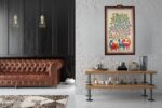 A modern living room featuring a 24×24 inch framed acrylic painting Petals of Promise with a red flower in bloom against a purple and blue abstract background, hanging above a wooden console with decorative elements.