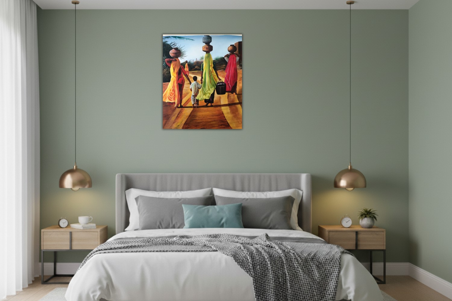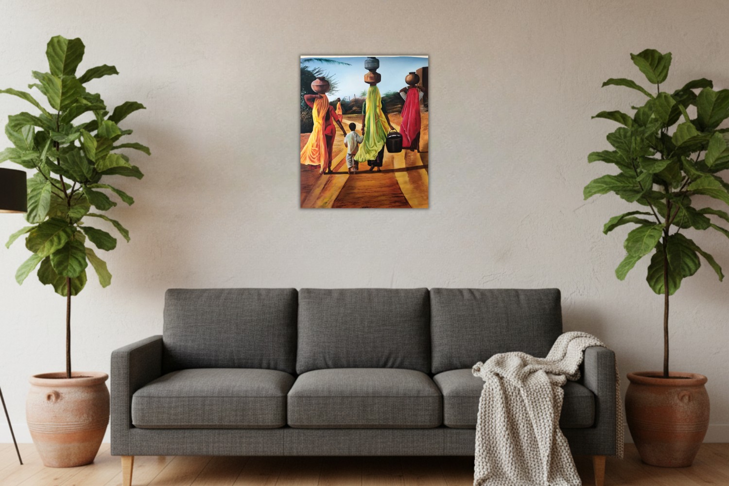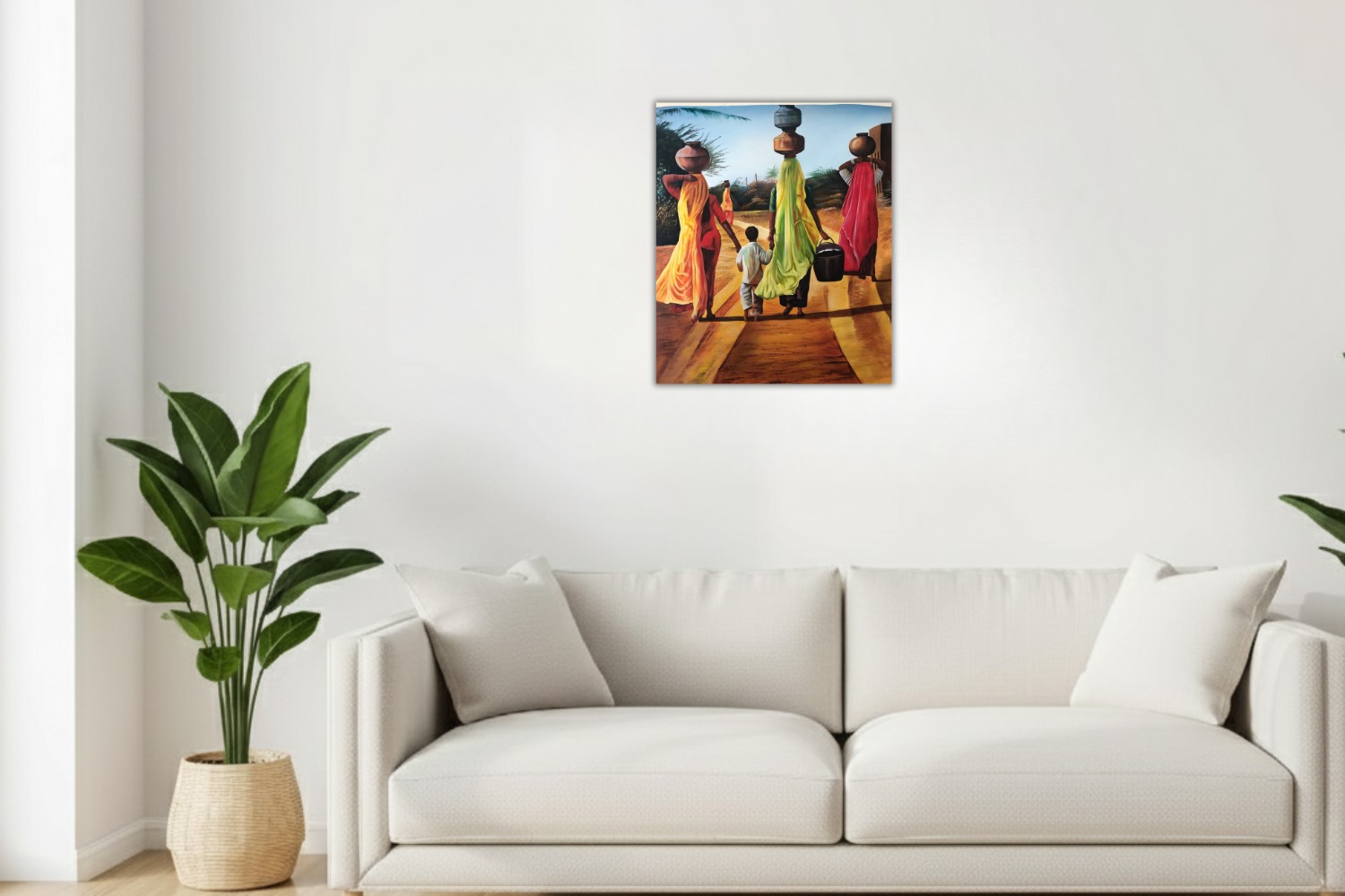 Journey for Water beautifully captures the essence of rural life and the strength of womanhood. The painting portrays three women and a child walking gracefully along a sunlit path. Dressed in vibrant saris of red, yellow, and green, the women balance earthen pots on their heads—symbols of daily perseverance and grace. The child, tenderly holding hands with two of the women, adds warmth and innocence to the composition. The interplay of golden light and earthy tones brings out the atmosphere of unity, endurance, and the quiet dignity found in everyday village life.