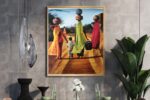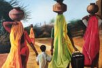 A vibrant acrylic painting depicting rural women and a child walking along a sunlit path, symbolizing strength, tradition, and unity in daily life.