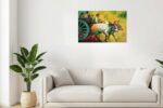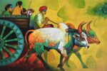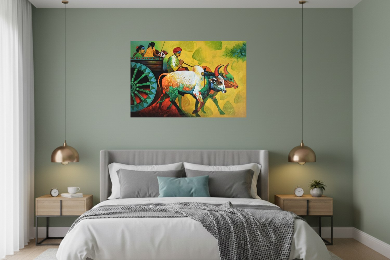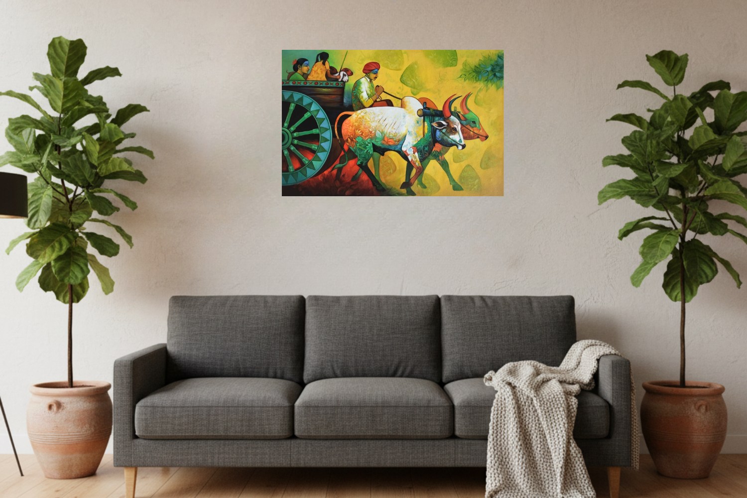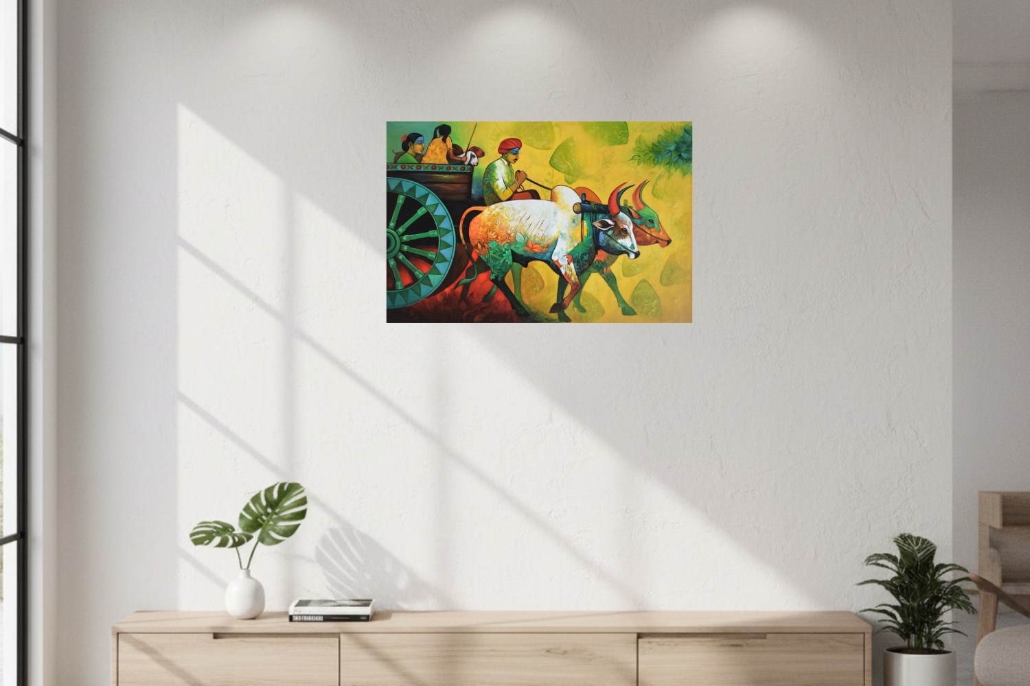 Journey Through the Countryside is a vivid celebration of India’s rural charm and timeless traditions. The artwork captures a picturesque scene of a bullock cart journeying along a sun-drenched path, guided by a man in a bright red turban. The two oxen, adorned with intricate floral patterns in shades of green, orange, and white, exude beauty and strength. Seated in the cart, women and children are surrounded by colorful fabrics, symbolizing simplicity, joy, and togetherness. With its glowing background of warm yellows and greens, this painting radiates the serenity and vibrance of village life.