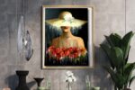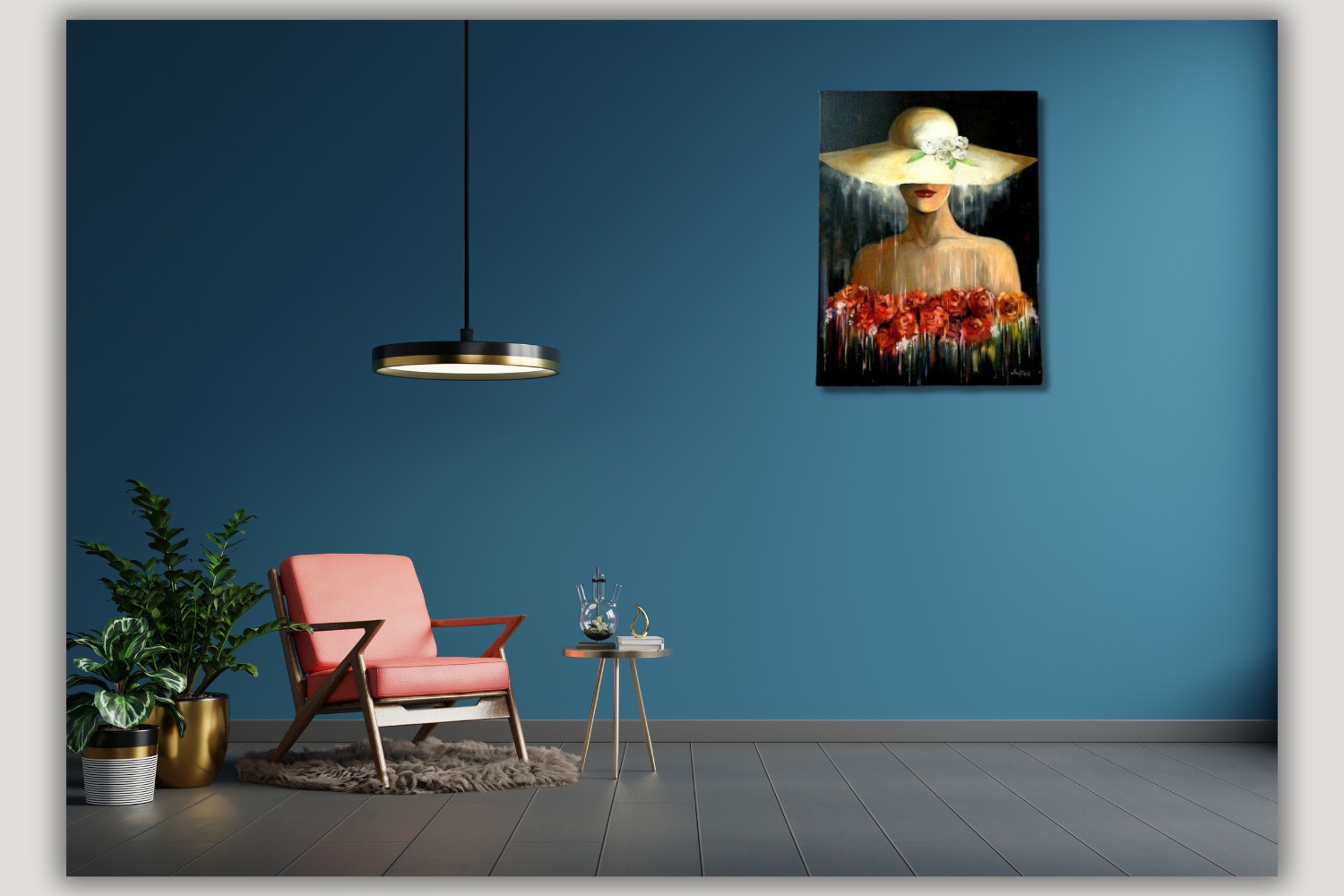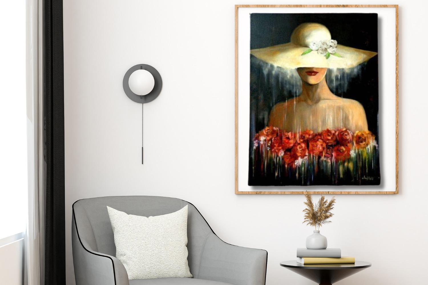 Lady in Bloom is a captivating acrylic painting that beautifully captures feminine elegance and mystery. The faceless woman, adorned with a wide-brimmed hat decorated with delicate white flowers, exudes grace and poise. Her cascading hat and bouquet of vivid red roses blend seamlessly into the background through soft, fluid brushstrokes. The subtle interplay of light and shadow symbolizes quiet confidence, beauty, and timeless charm — making it a perfect statement piece for any sophisticated interior.