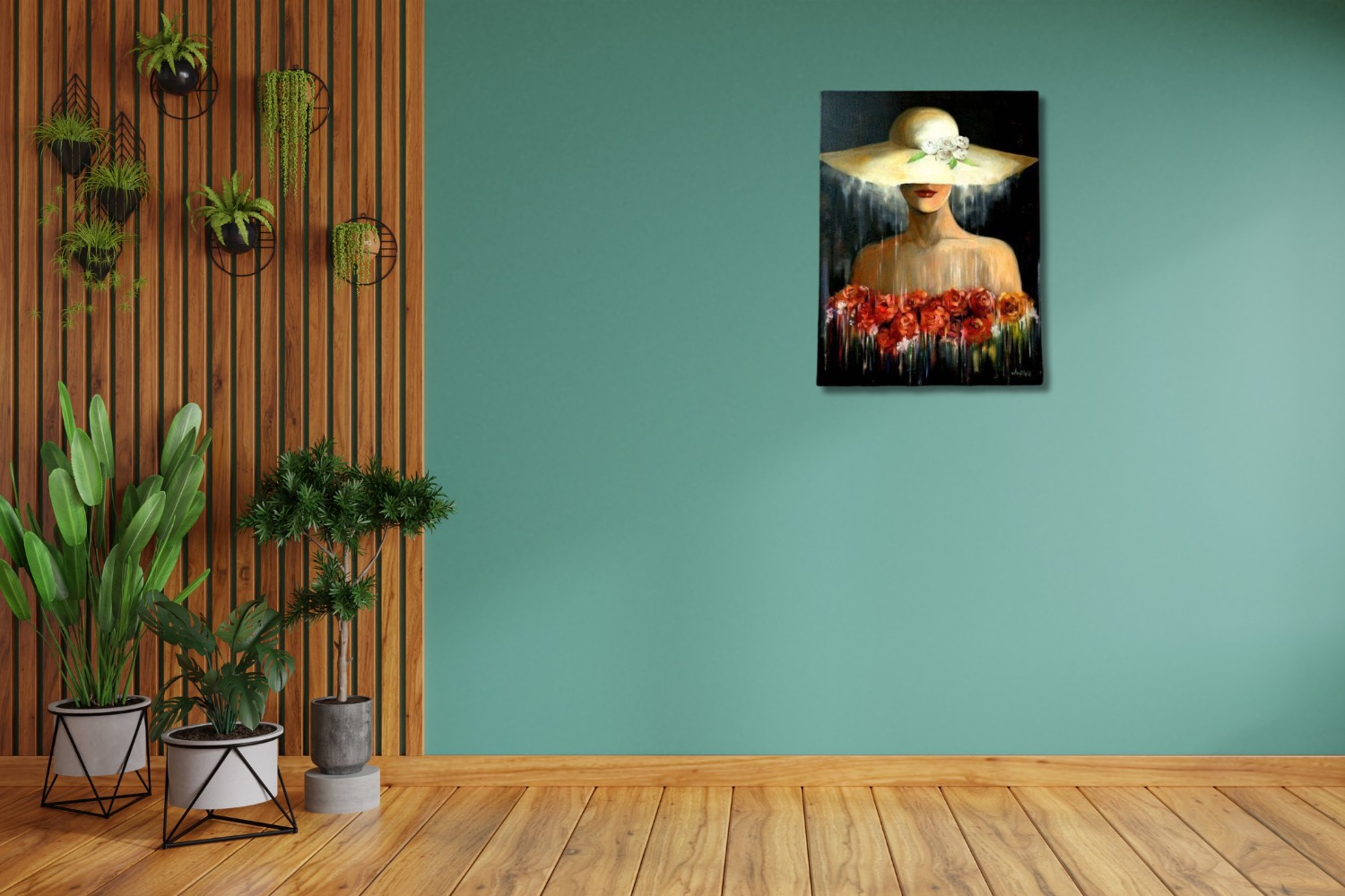 An elegant painting of a woman wearing a floral hat, blending soft tones and vivid roses to express grace and confidence.