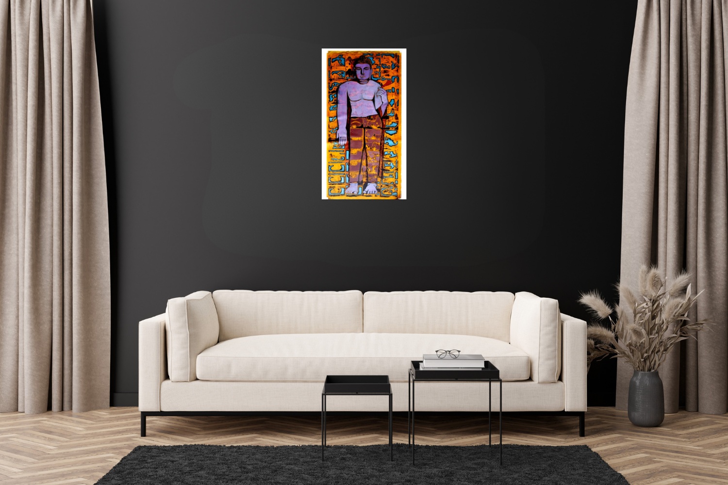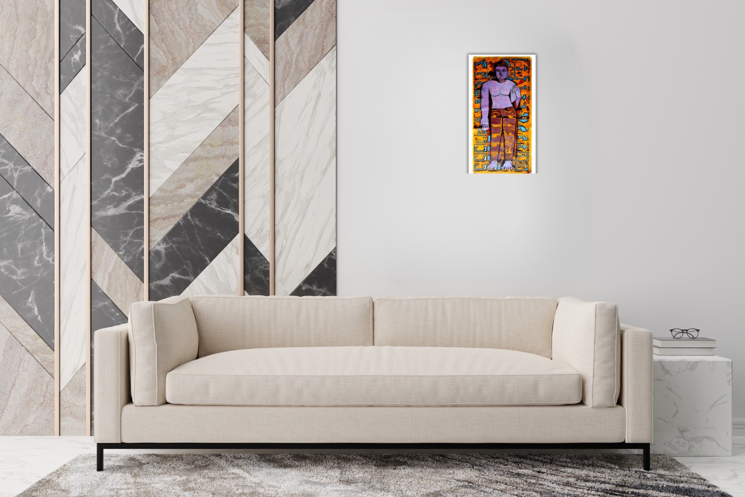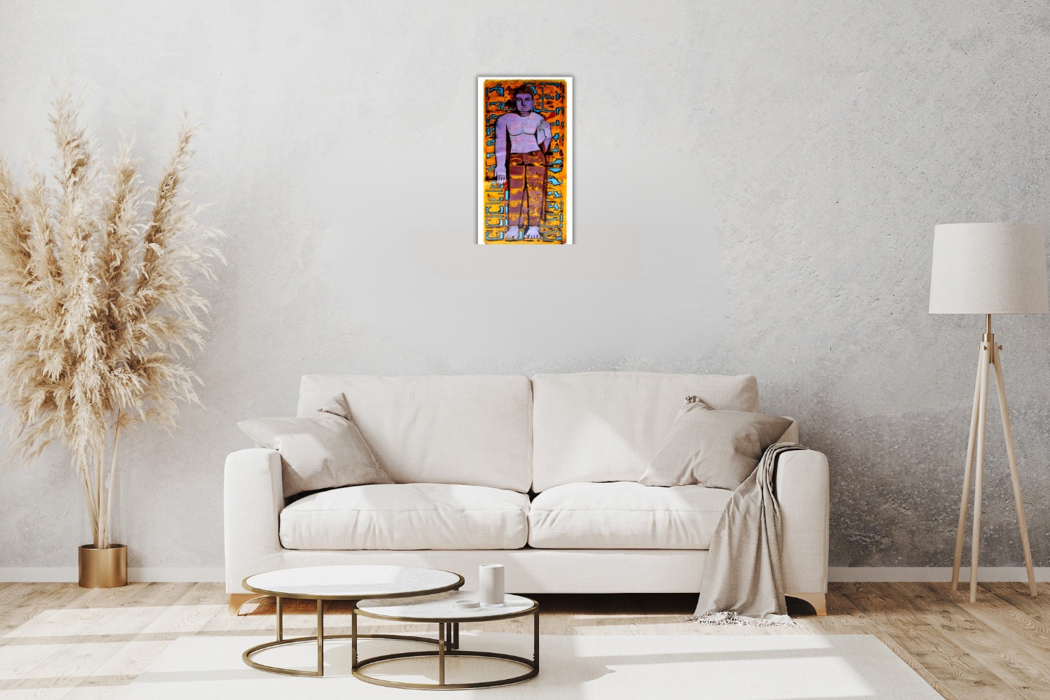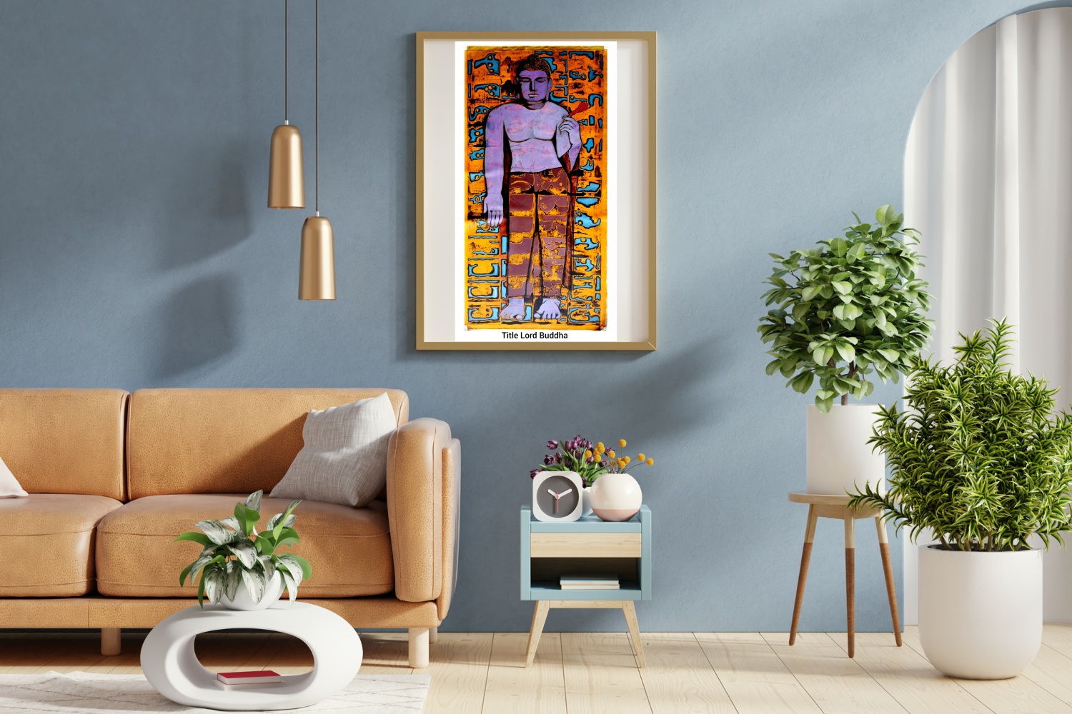 Lord Buddha is a serene acrylic painting on canvas that harmoniously blends spiritual calm with modern abstraction. The artwork portrays a stylized standing figure of Lord Buddha in tranquil shades of purple and pink, radiating peace and mindfulness. His robe, rendered in warm earthy tones of brown and yellow, contrasts beautifully with the dynamic orange and blue background.