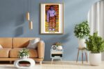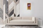 The geometric and abstract elements in the backdrop add depth and modern sophistication, symbolizing the union of enlightenment and inner balance. This painting evokes a meditative atmosphere — perfect for interiors seeking spiritual calm and aesthetic harmony.