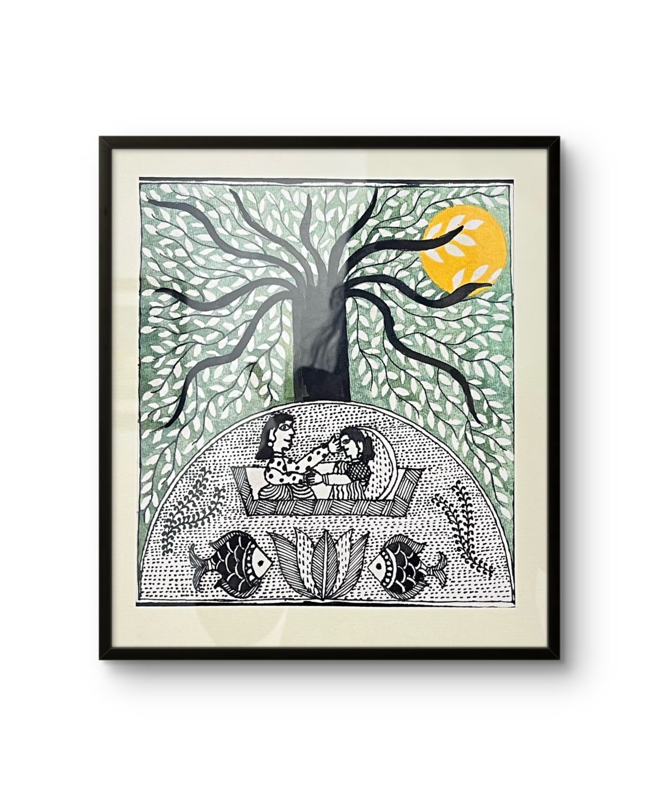 This exquisite Madhubani painting portrays two serene figures seated beneath a grand, symbolic tree — representing life, connection, and nature’s eternal harmony. The delicate black linework is complemented by soft green foliage and a bright yellow sun, creating a soothing and balanced composition.