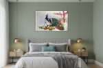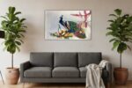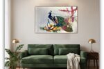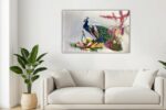Majestic Companions beautifully portrays the grace and harmony of two peafowls resting on a blooming branch. The male’s magnificent feathers shimmer in radiant shades of emerald, sapphire, and gold, while the peahen’s soft, earthy tones bring gentle balance. Delicate blossoms in hues of pink, yellow, and lavender surround the pair, enhancing the sense of natural elegance. The composition symbolizes beauty, togetherness, and the serenity found in nature’s companionship.