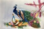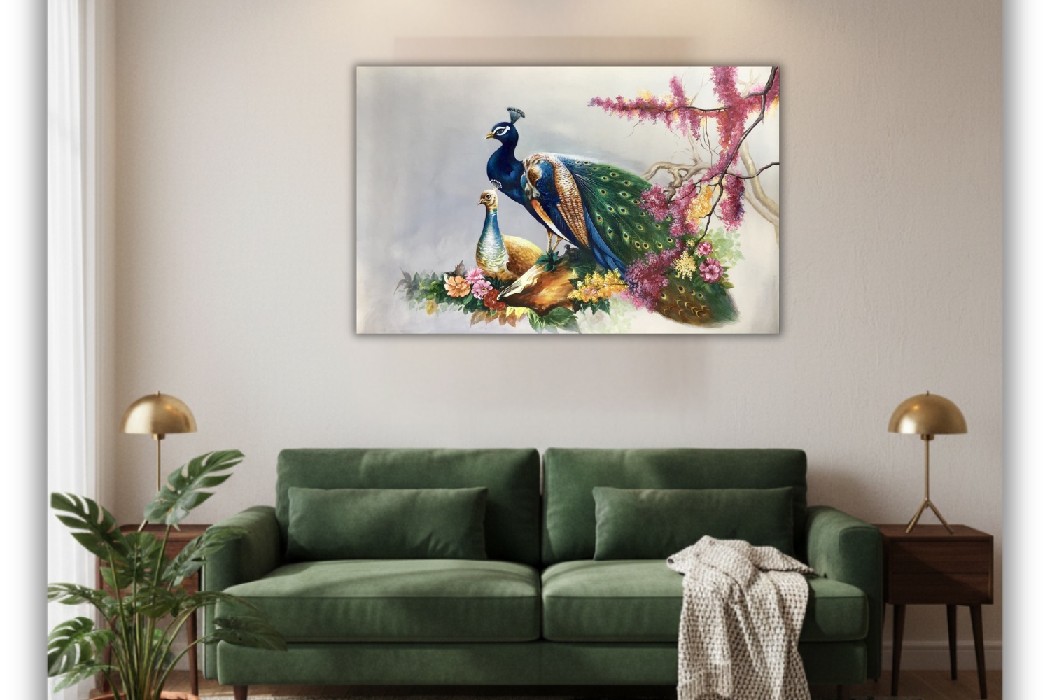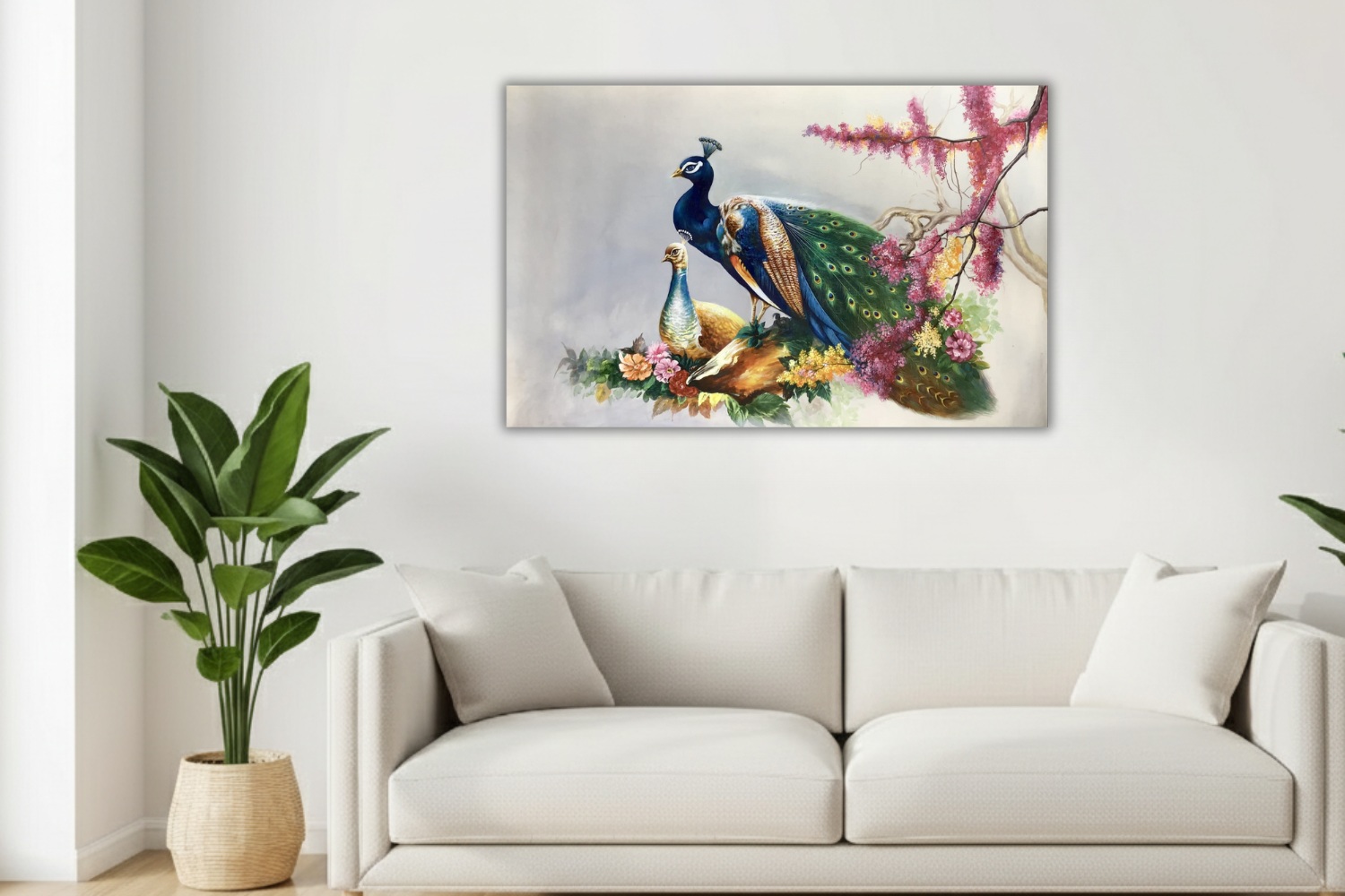 A vibrant nature painting of two peafowls resting on a blooming branch — symbolizing harmony, companionship, and timeless grace.