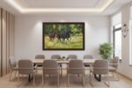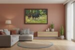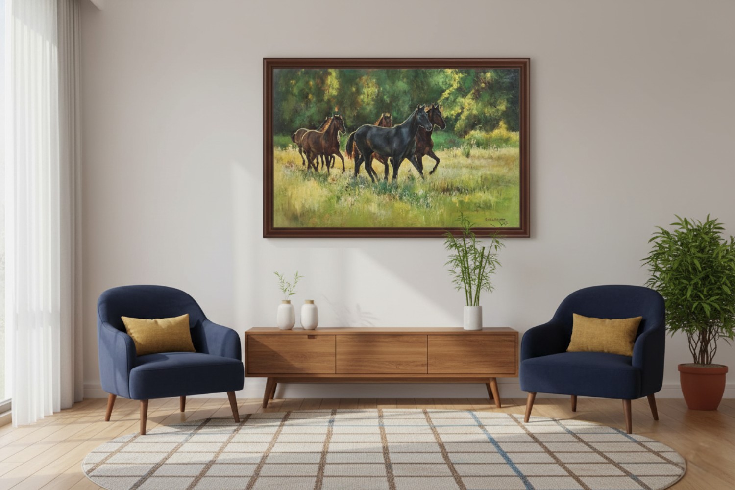 A serene and captivating artwork showcasing five majestic horses set against a lush green field. The painting beautifully captures their grace, unity, and untamed spirit, making it a perfect symbol of freedom, strength, and harmony with nature. Each brushstroke highlights the deep bond between the animals and the tranquility of their surroundings. This piece radiates movement and balance — an inspiring addition to any space that values natural beauty and positive energy.