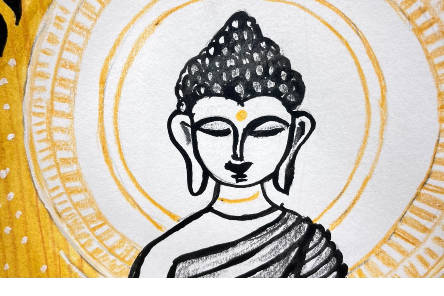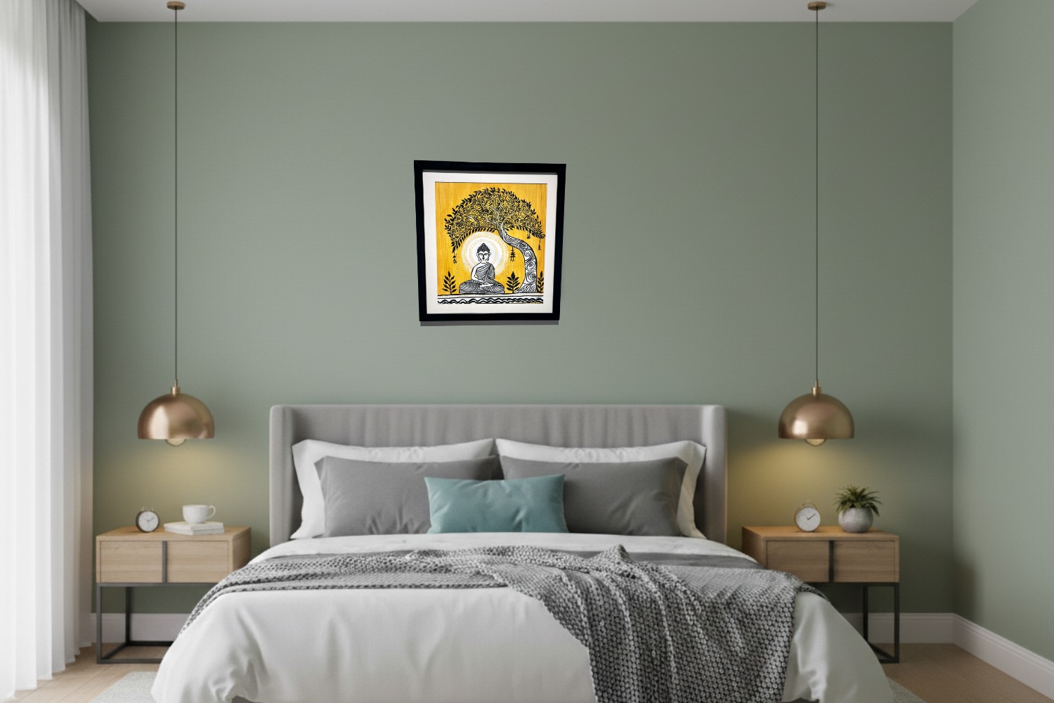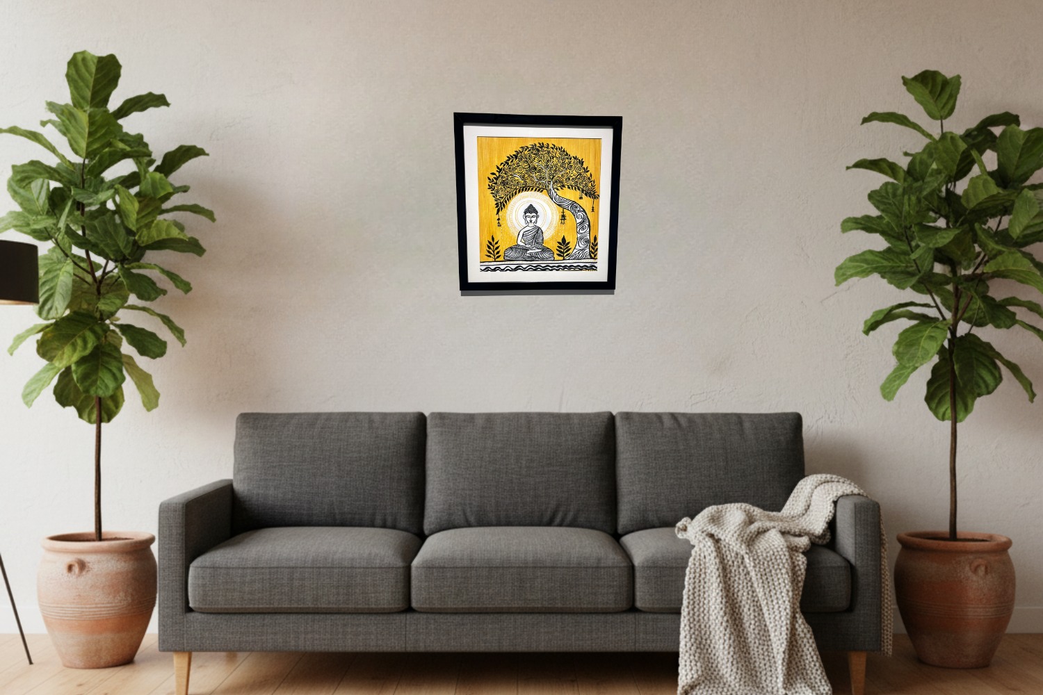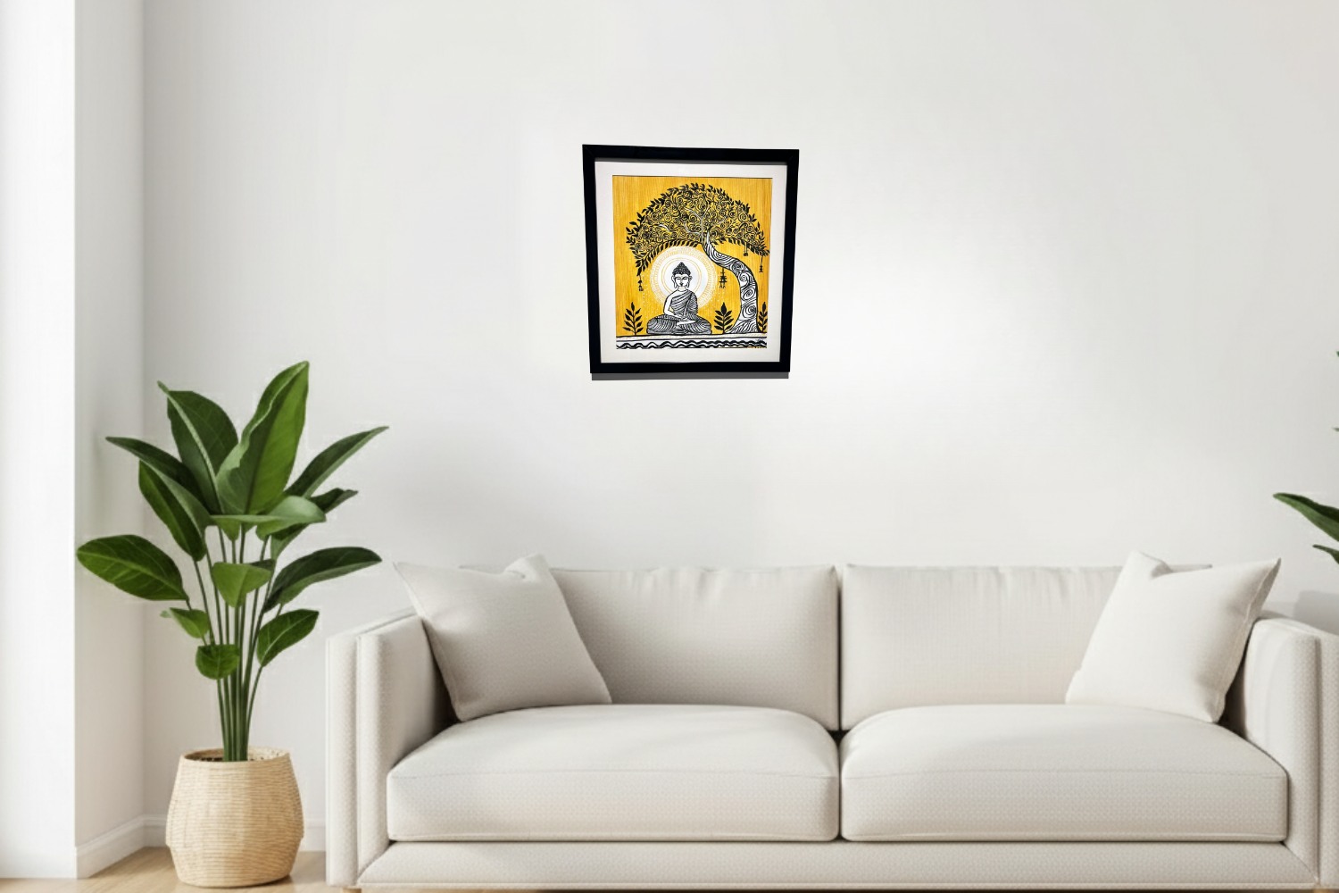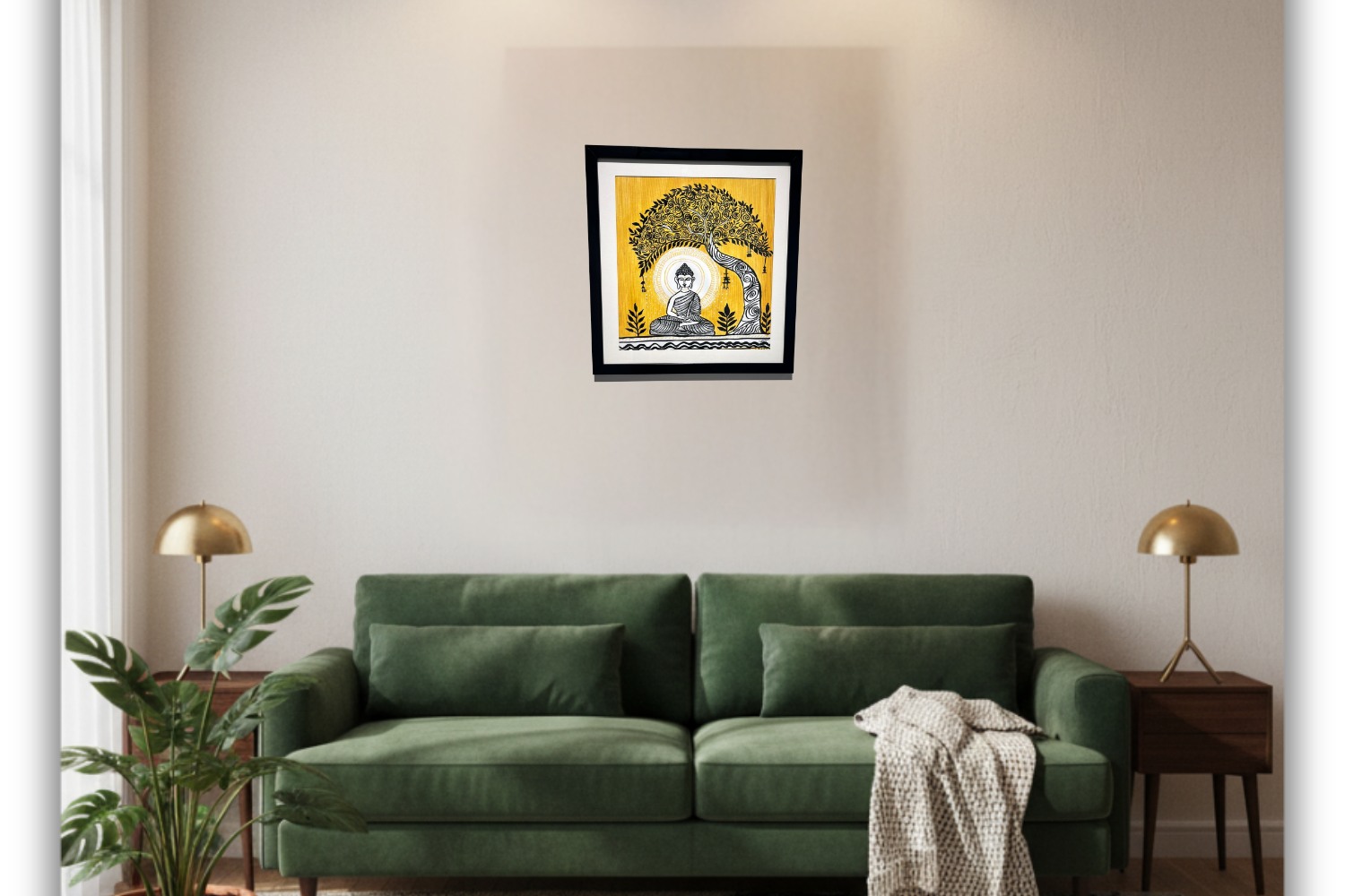Meditation Under the Bodhi Tree captures the profound serenity of Lord Buddha in deep meditation beneath the sacred Bodhi tree — the symbol of enlightenment and spiritual awakening. The artist’s use of bold black detailing against a luminous yellow backdrop reflects the balance between stillness and illumination. This harmonious blend of traditional motifs and modern simplicity radiates peace, mindfulness, and wisdom, offering a perfect centerpiece for tranquil and spiritual interiors.