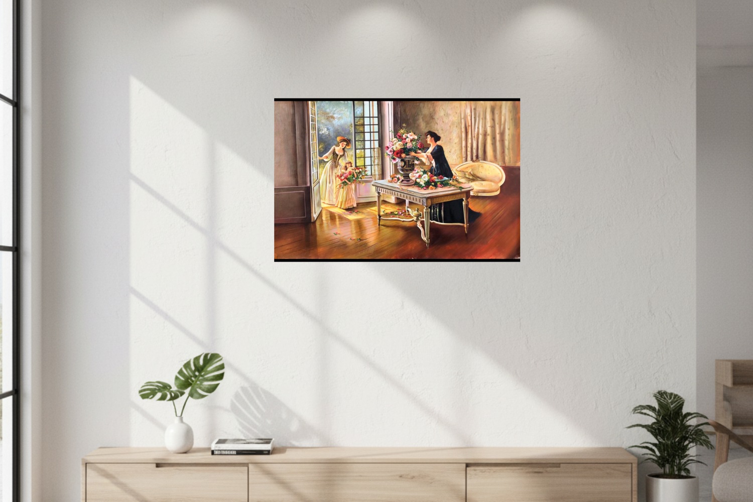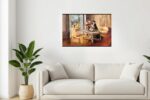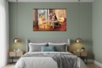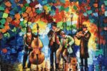 Melody in the Park beautifully captures the soulful energy of musicians performing in an open park bathed in the warm glow of evening lights. Four artists — playing the double bass, violin, accordion, and trumpet — stand surrounded by autumn trees alive with shades of orange, yellow, and crimson. The impressionistic brushstrokes and vivid reflections on the wet ground add rhythm and movement, mirroring the harmony of their music. This painting evokes the charm of spontaneous creativity and the joy of shared melodies in nature’s embrace.