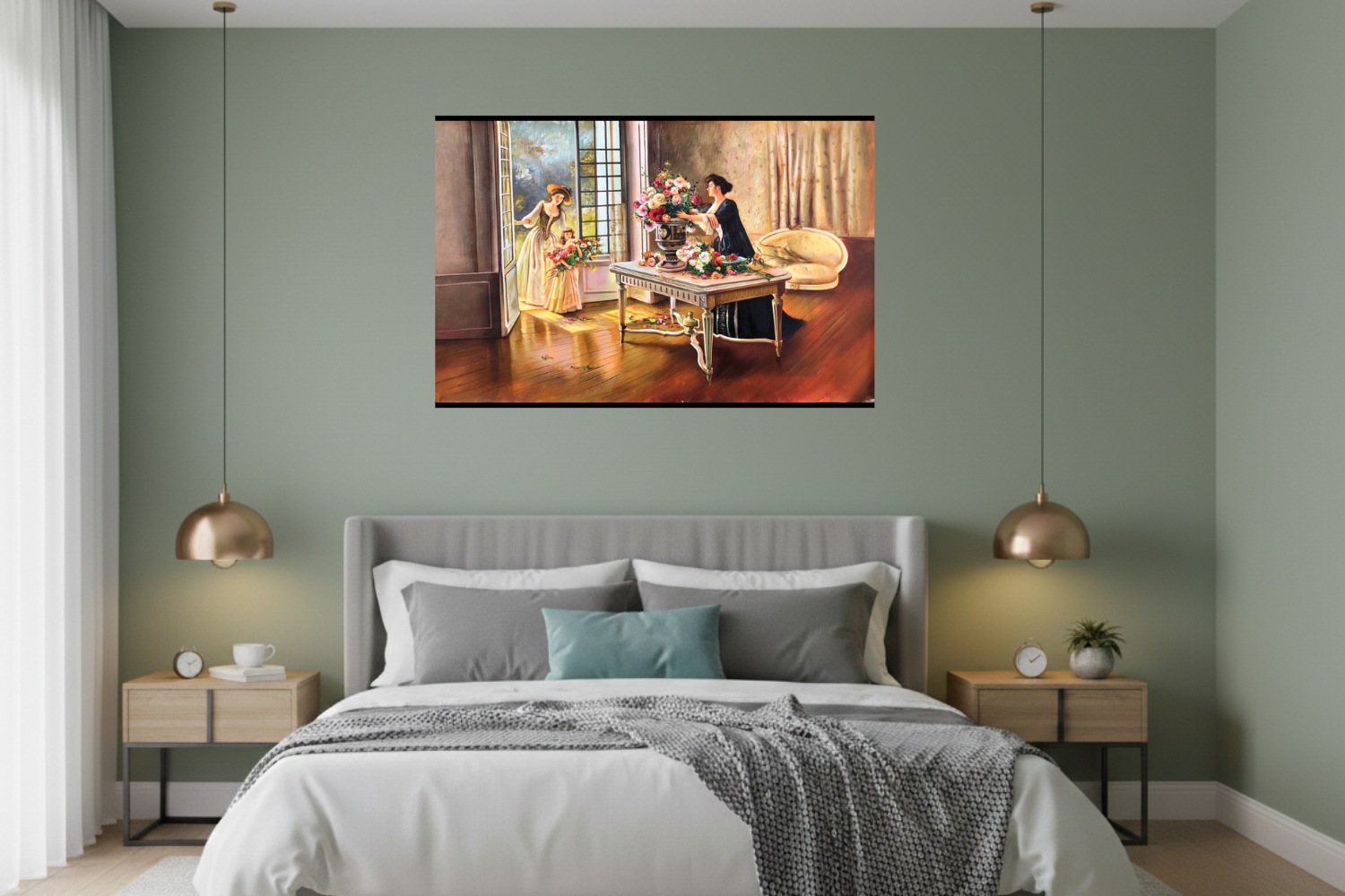 Fragments of Light and Time abstract lotus painting displayed above a modern bed in a stylish bedroom – Artzera Gallery wall art