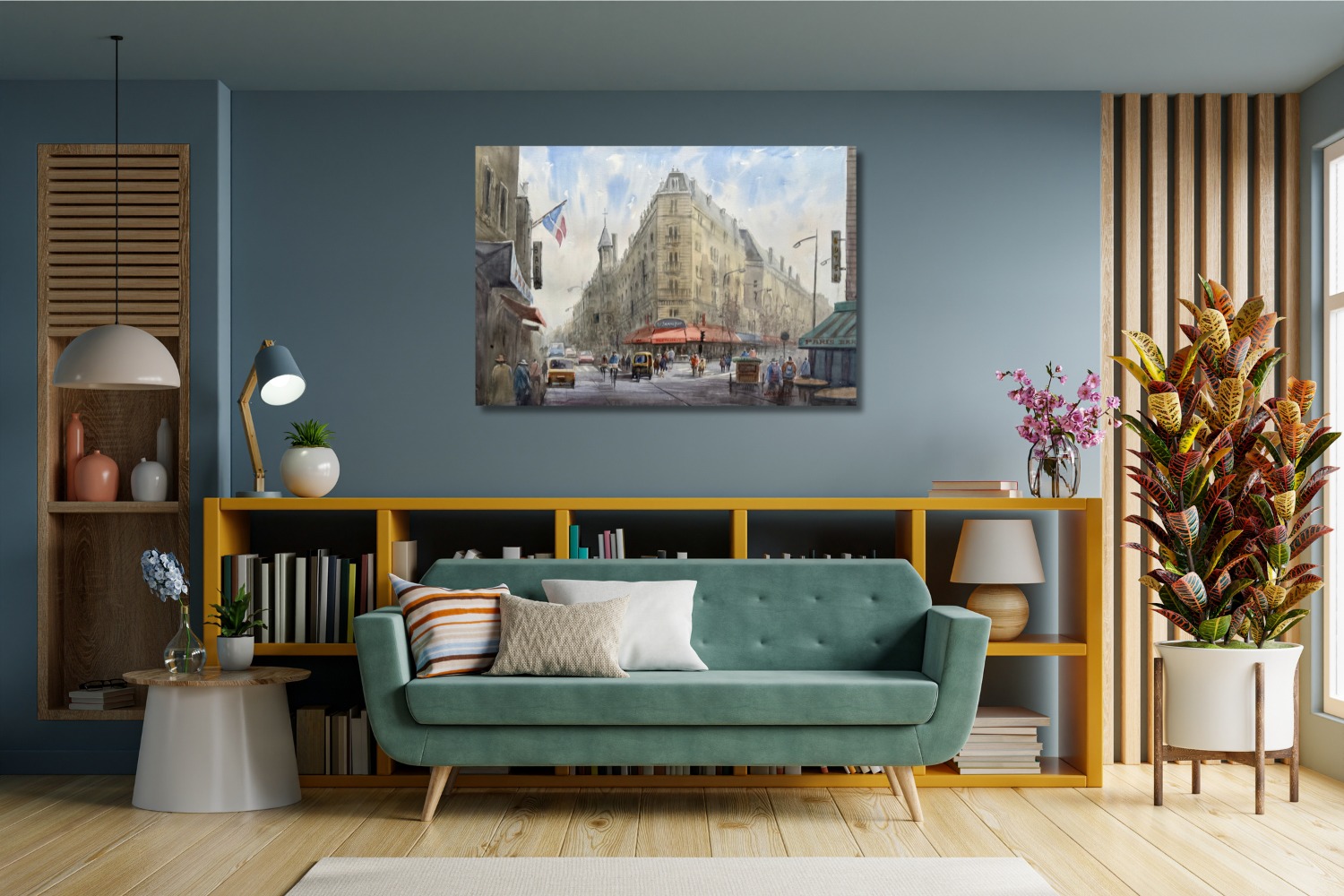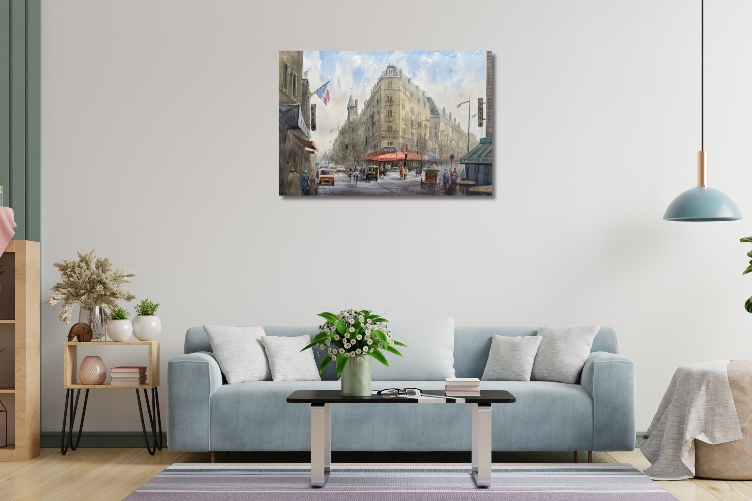 Parisian Street Scene beautifully captures the charm and romance of Parisian life. The painting portrays a lively street filled with pedestrians, vehicles, and the vibrancy of everyday city life. Elegant European-style buildings with ornate balconies and slanted rooftops frame the composition, while a French flag waves proudly to the left.