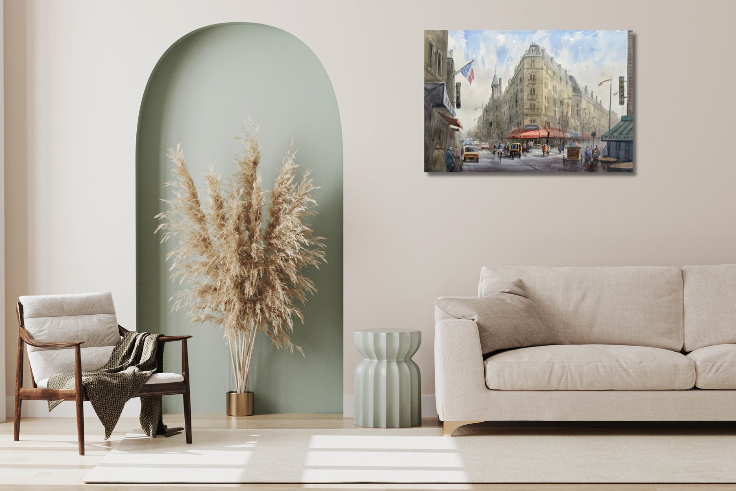 The iconic café “Le Souvenir” with its red canopy adds warmth to the scene, and the soft, hazy sky with muted tones evokes a dreamy, nostalgic atmosphere. This 25 × 40 inch original watercolor on paper is perfect for adding elegance and character to any modern or classic interior.