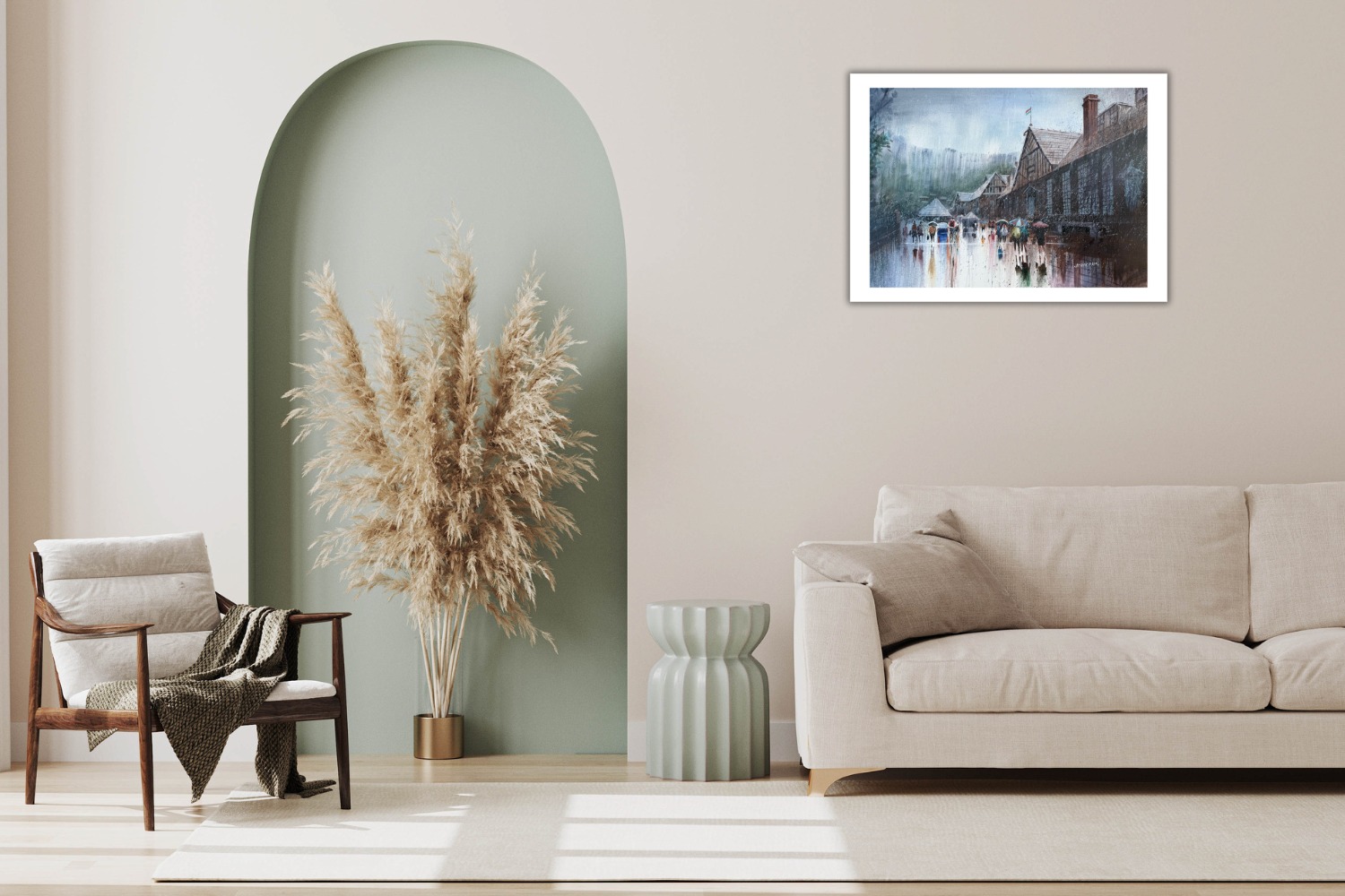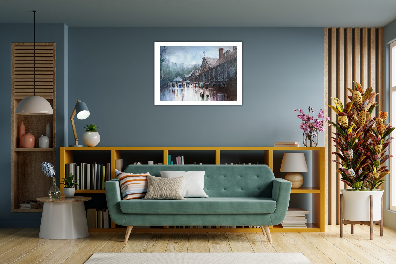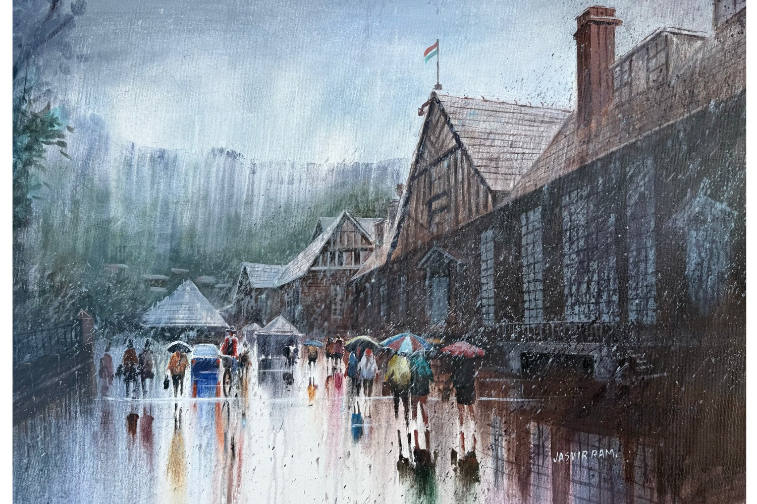 People walking under colorful umbrellas bring life to the scene, their reflections glowing on the glistening wet street. Through delicate brushwork and harmonious tones, this artwork blends Shimla’s rich heritage architecture with the refreshing spirit of rainfall, making it a soulful tribute to the timeless charm of the hill-station.