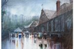 Rainy Day at Shimla Ridge beautifully captures the romance of monsoon in the hills. The artwork highlights colonial-era buildings with sloping roofs and intricate wooden facades, including one adorned with the Indian flag. The rain softens the outlines of the distant hills, creating a misty depth that evokes both atmosphere and nostalgia.