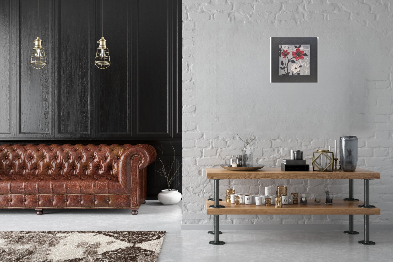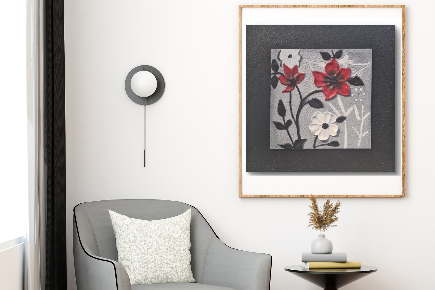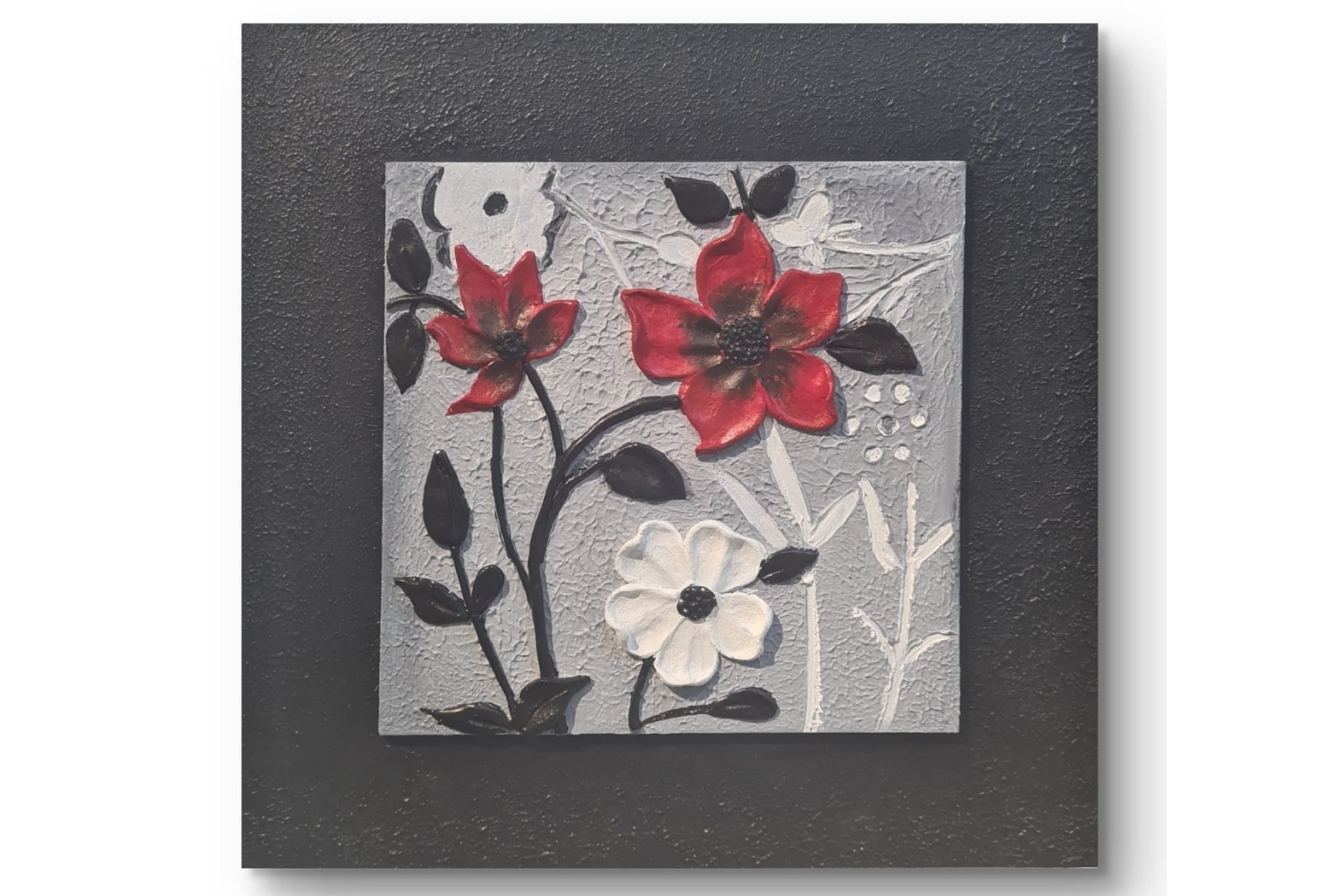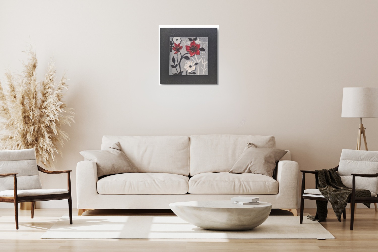 Red Blossoms on Gray is a textured floral painting featuring vivid red and white flowers blooming against a soft gray backdrop. The contrast of black leaves and raised textures adds depth and sophistication, creating a perfect balance of modern elegance and warmth. This piece beautifully complements contemporary interiors while adding a lively yet graceful touch.