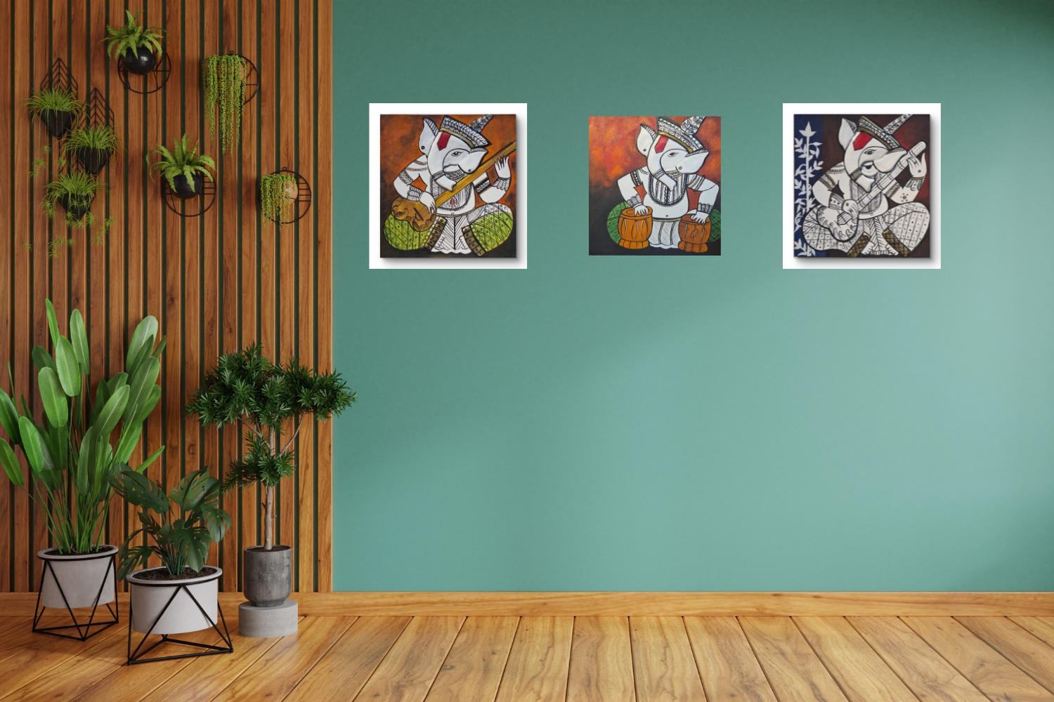 Portrays Lord Ganesha in a joyful, musical form