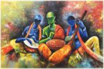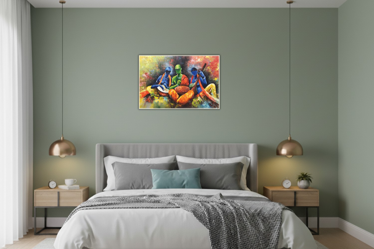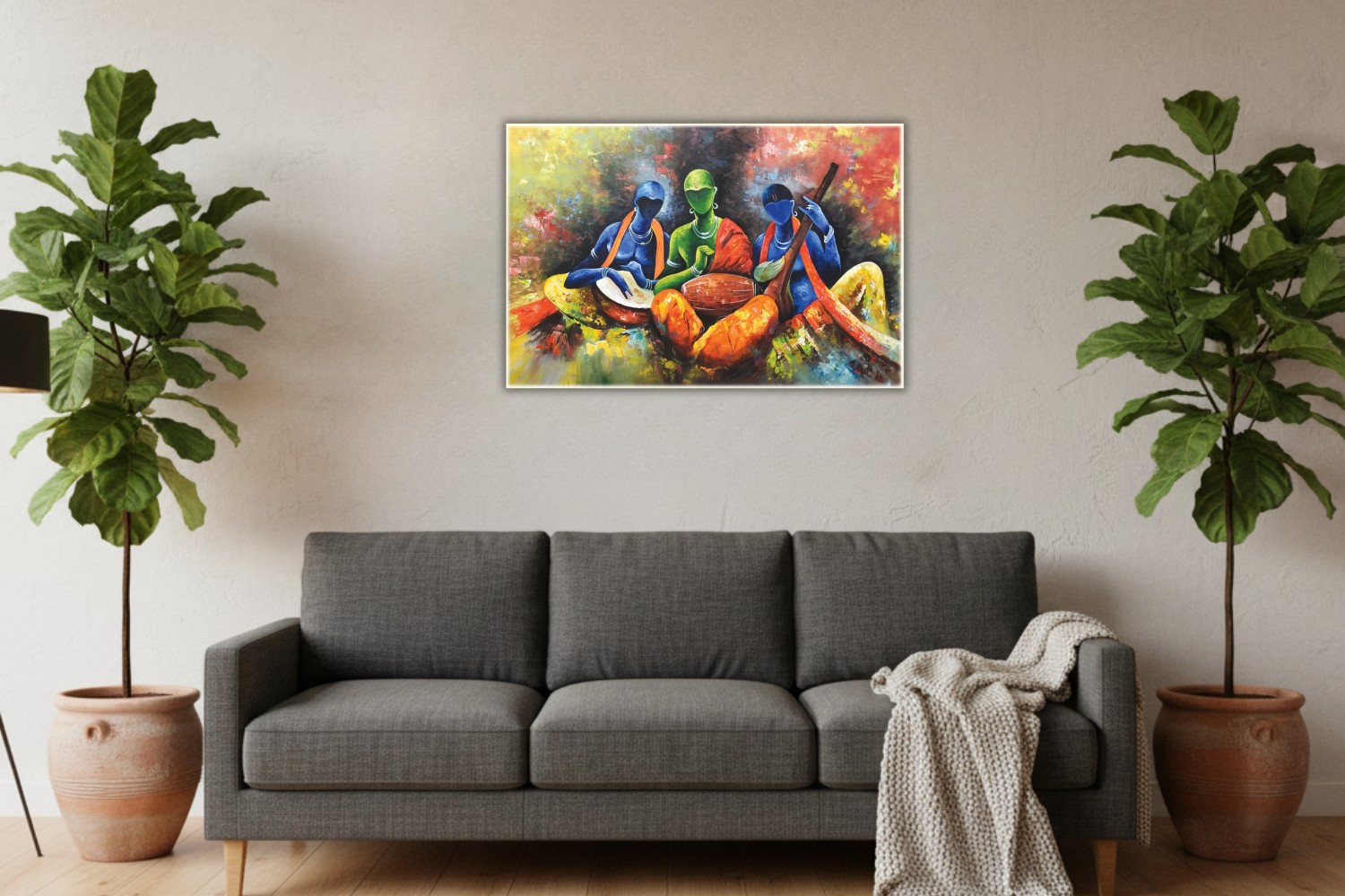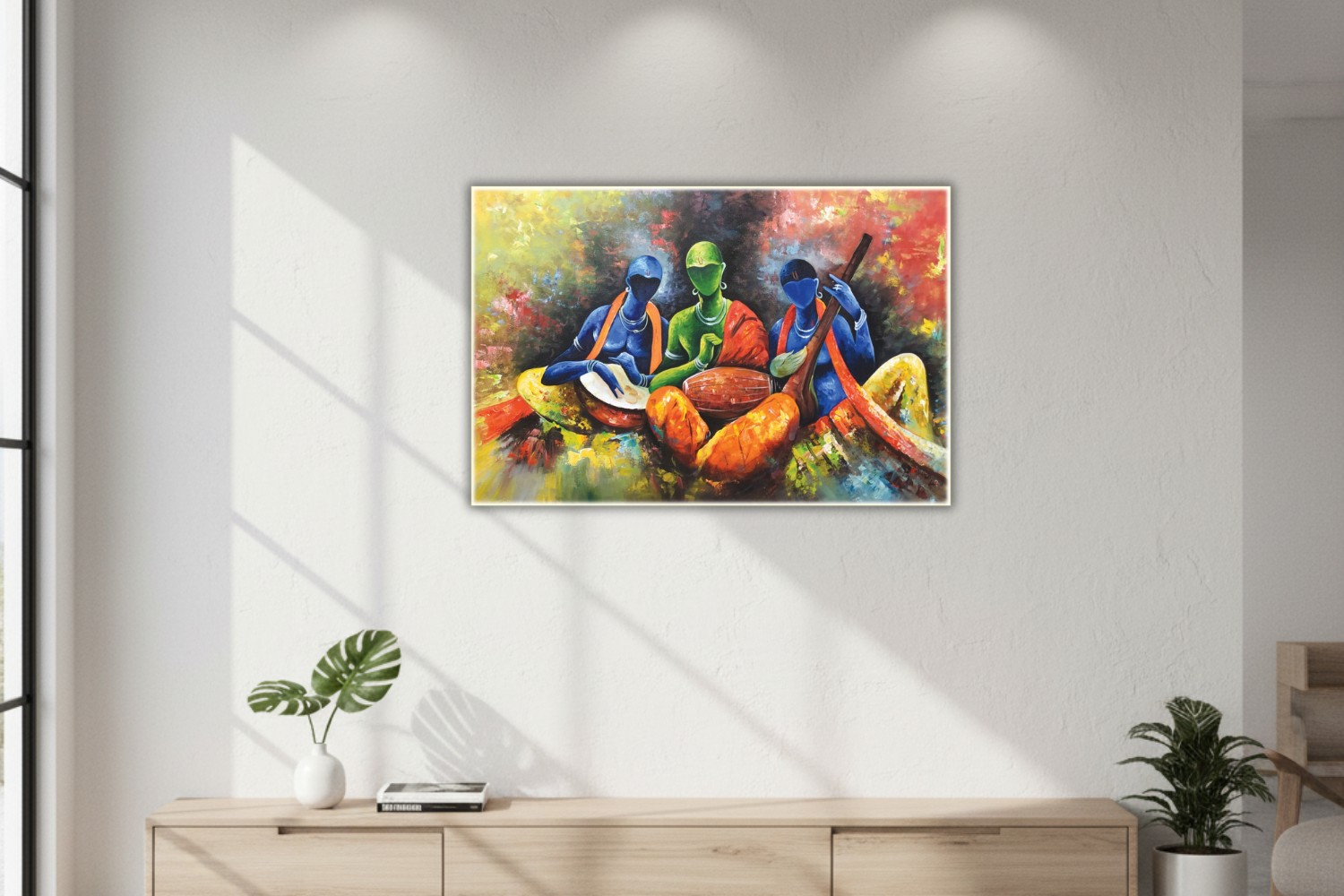 Rhythms of Togetherness portrays three faceless musicians immersed in the soulful rhythm of Indian classical music. Each musician is depicted holding a unique instrument — a drum, a stringed instrument, and a tanpura — symbolizing the harmony of diverse sounds blending into one melody. The vibrant hues of blue, green, orange, and yellow create a festive aura, while their flowing scarves and expressive postures evoke energy and movement. The abstract background of swirling colors enhances the sense of unity, creativity, and joy, celebrating the cultural richness of Indian music.