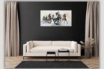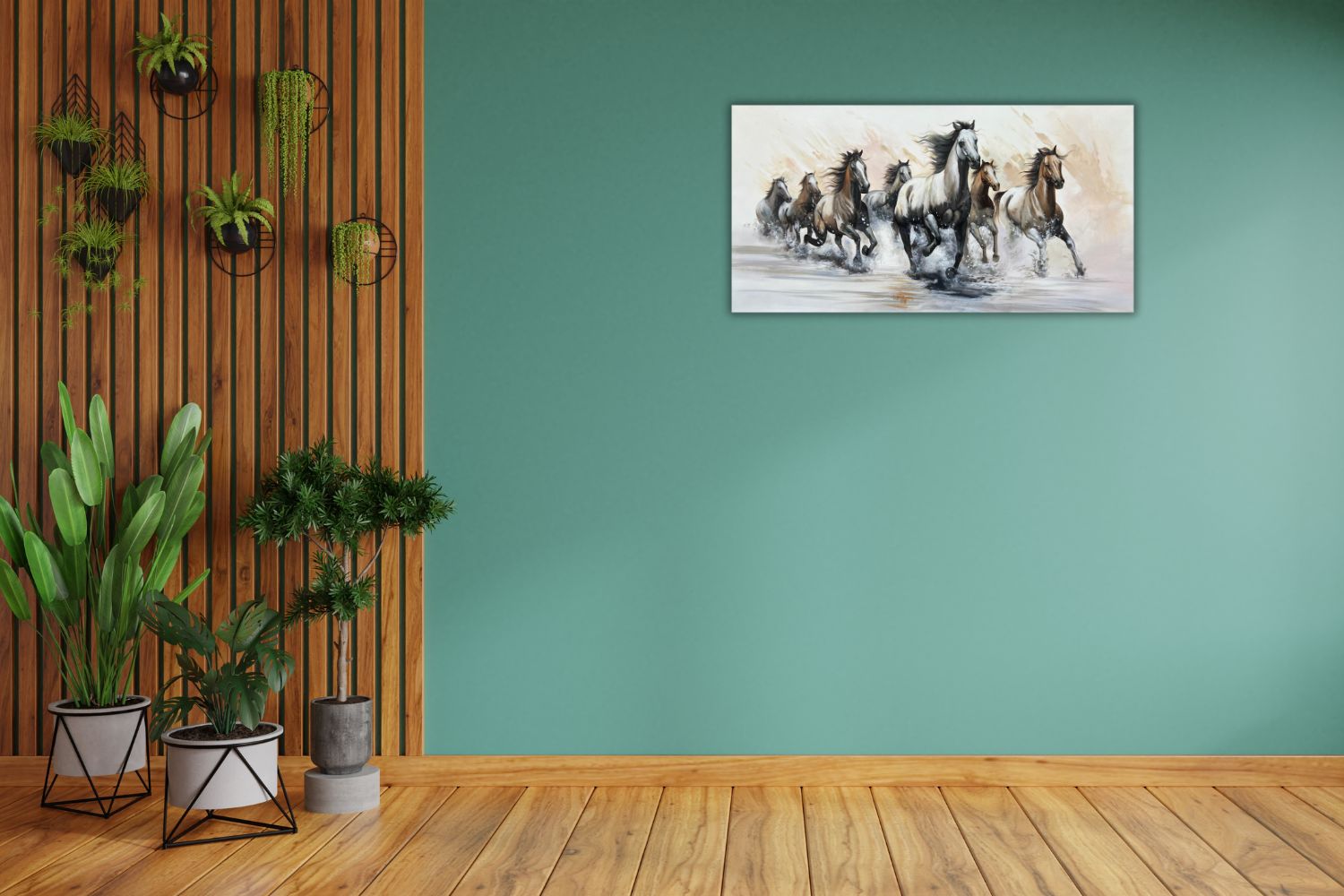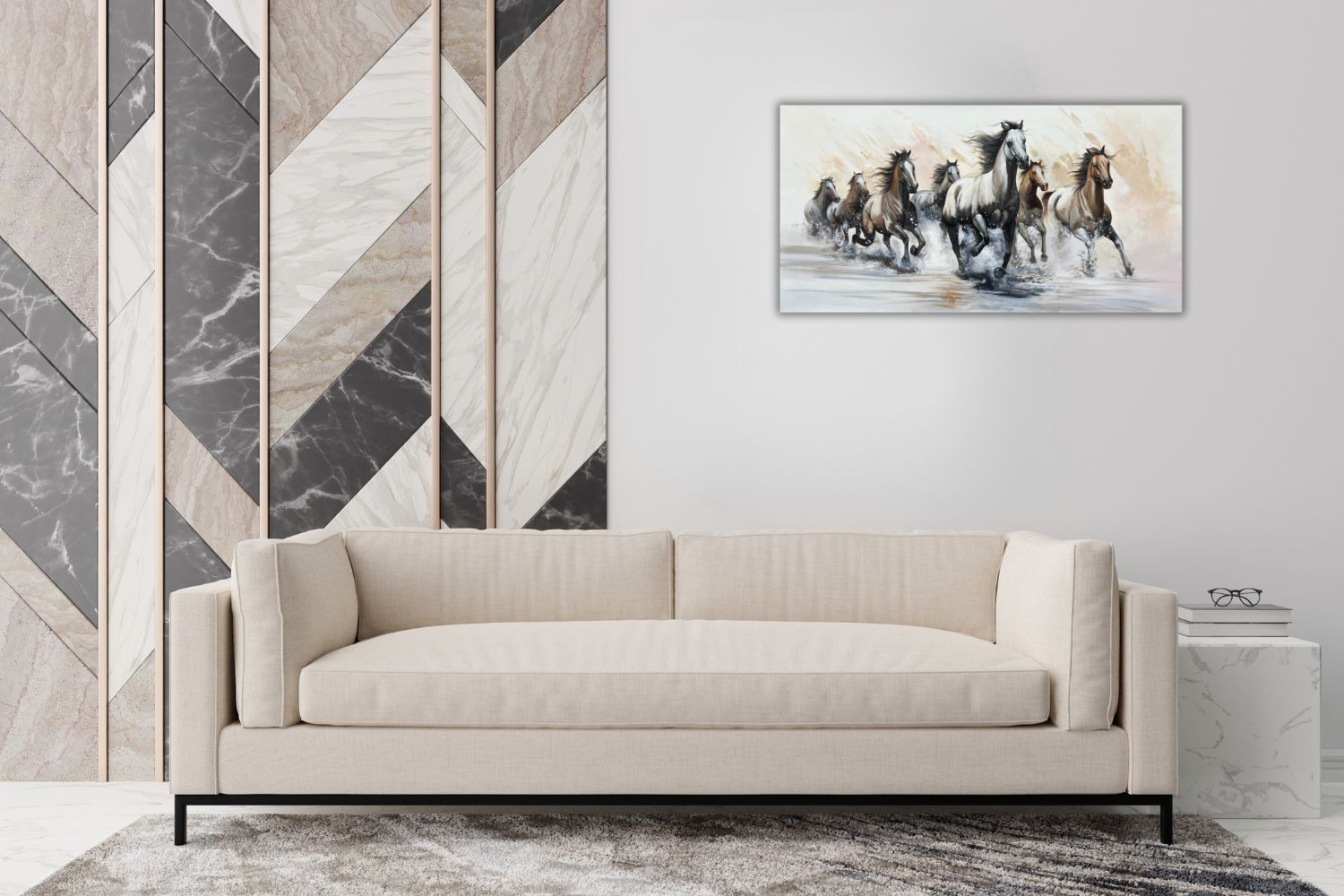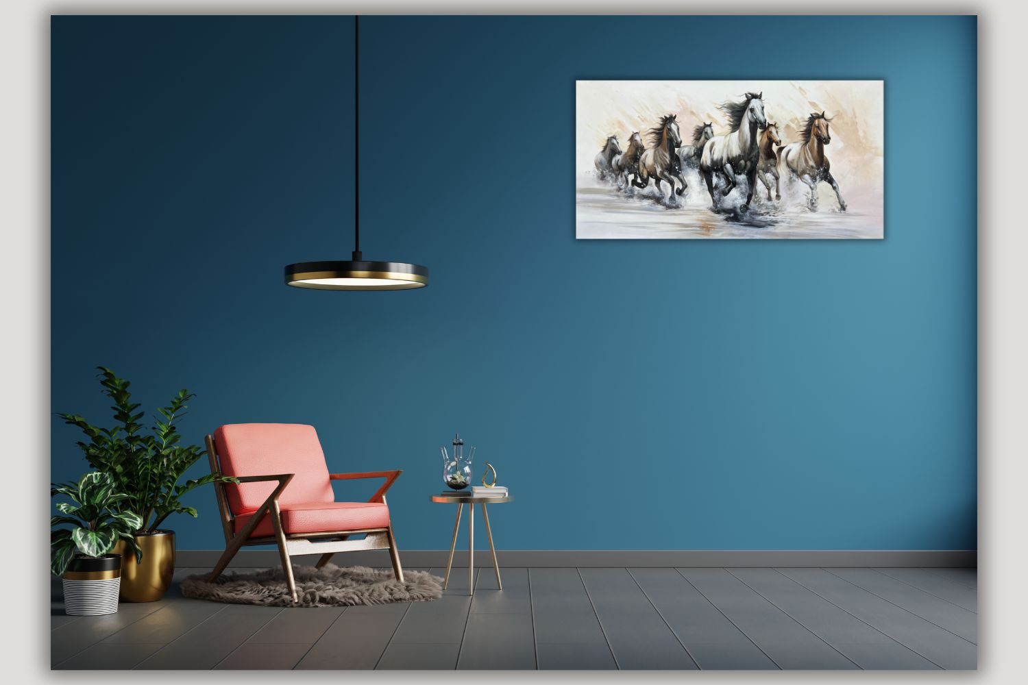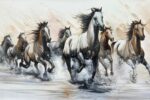Running Free is a dynamic and soulful painting that captures the untamed energy of wild horses galloping through shallow waters. The rhythmic movement of their flowing manes and splashing hooves reflects strength, grace, and freedom. Rendered in soothing shades of white, brown, and gray, the composition balances motion and serenity — celebrating the raw spirit of nature and the beauty of life unbound.