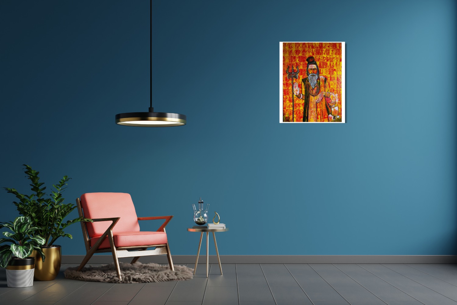 The figure, with a long grey beard and calm expression, holds a trident (trishul) in one hand — representing Lord Shiva — and a kamandalu (water pot) in the other, symbolizing purity and renunciation. Bold brushstrokes and warm tones convey a divine aura and spiritual strength. Intricate detailing in the robes and accessories adds depth, creating a composition that radiates peace, wisdom, and ascetic power.