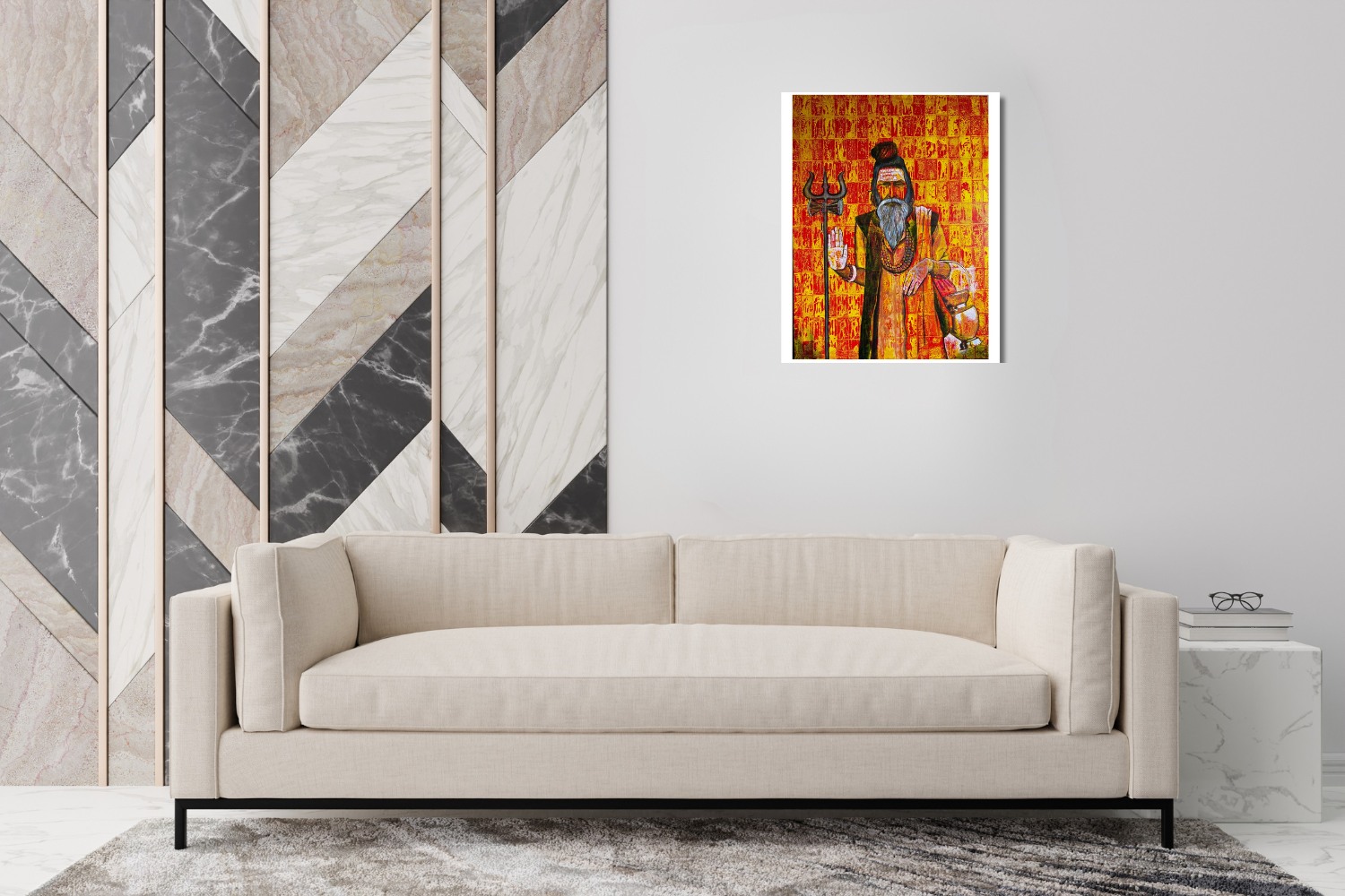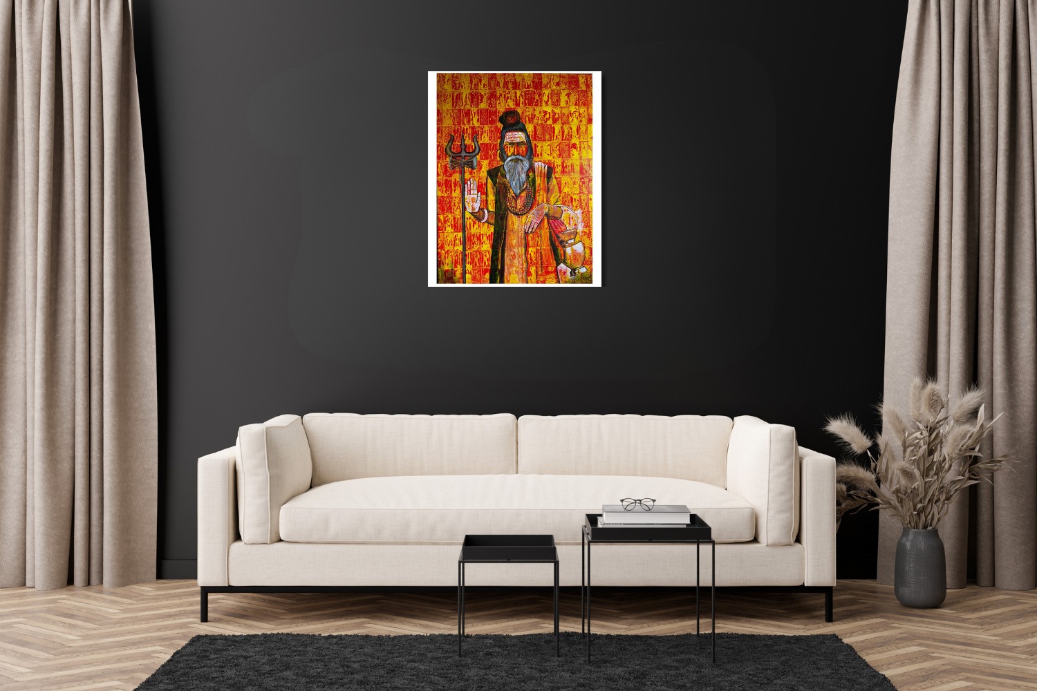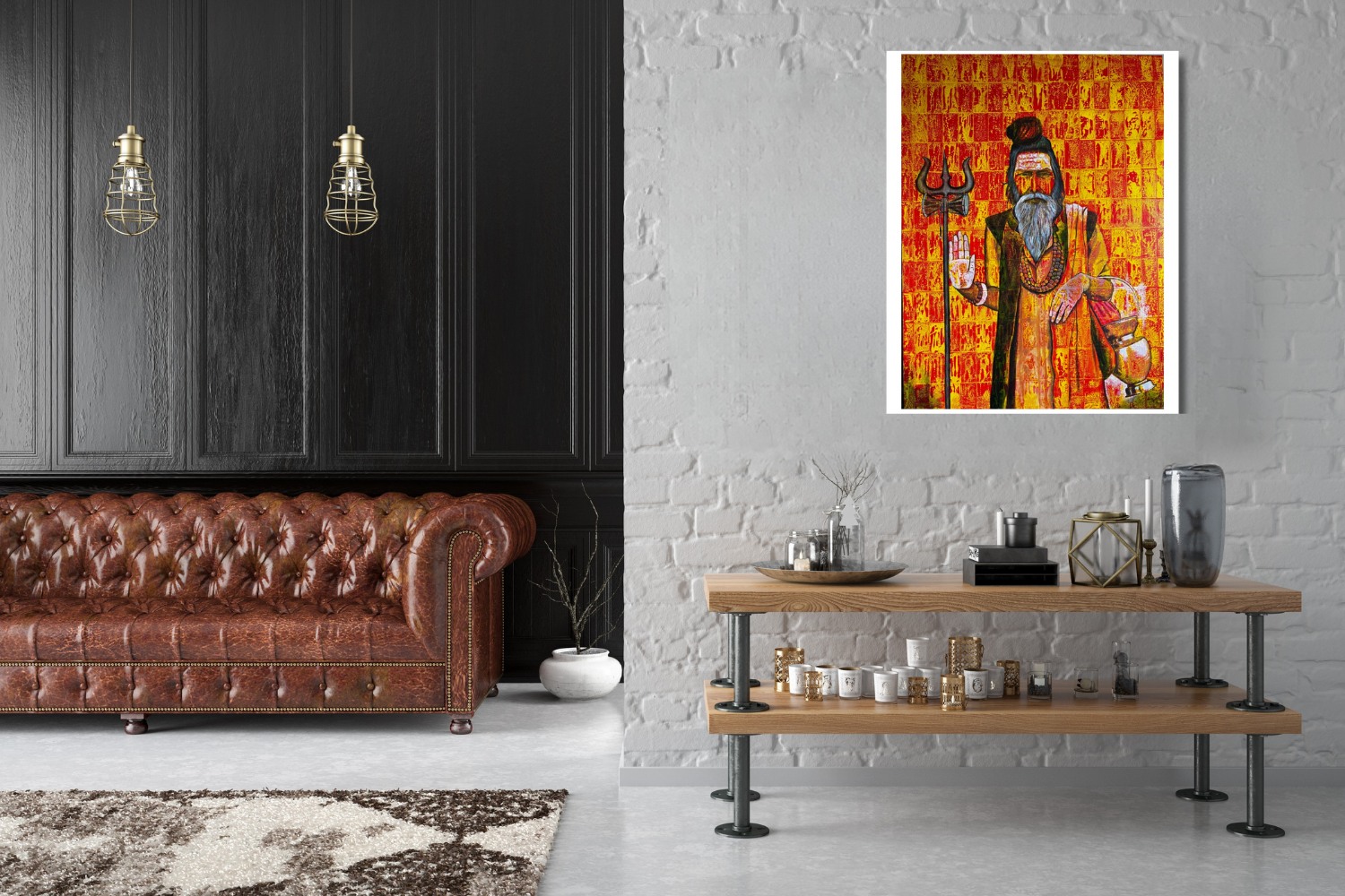 Sadhu Baba is a striking acrylic painting on canvas capturing the serene presence and spiritual depth of a holy ascetic deeply rooted in Indian tradition. The artwork portrays the Sadhu standing gracefully against a vibrant yellow and red textured background, symbolizing energy, devotion, and enlightenment.