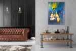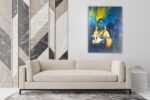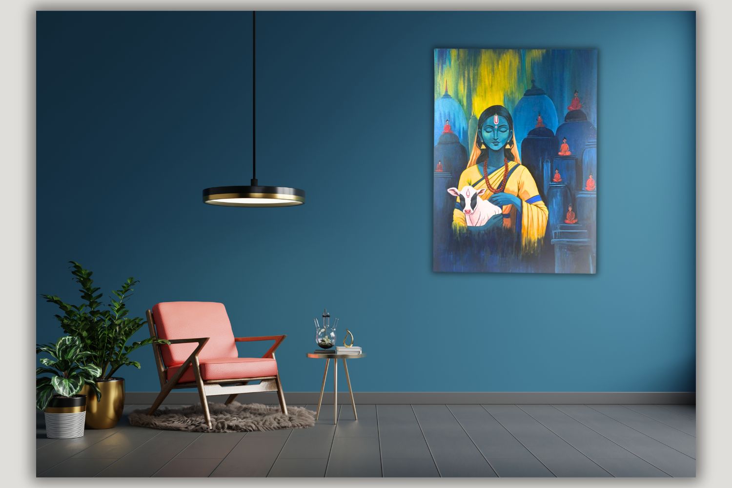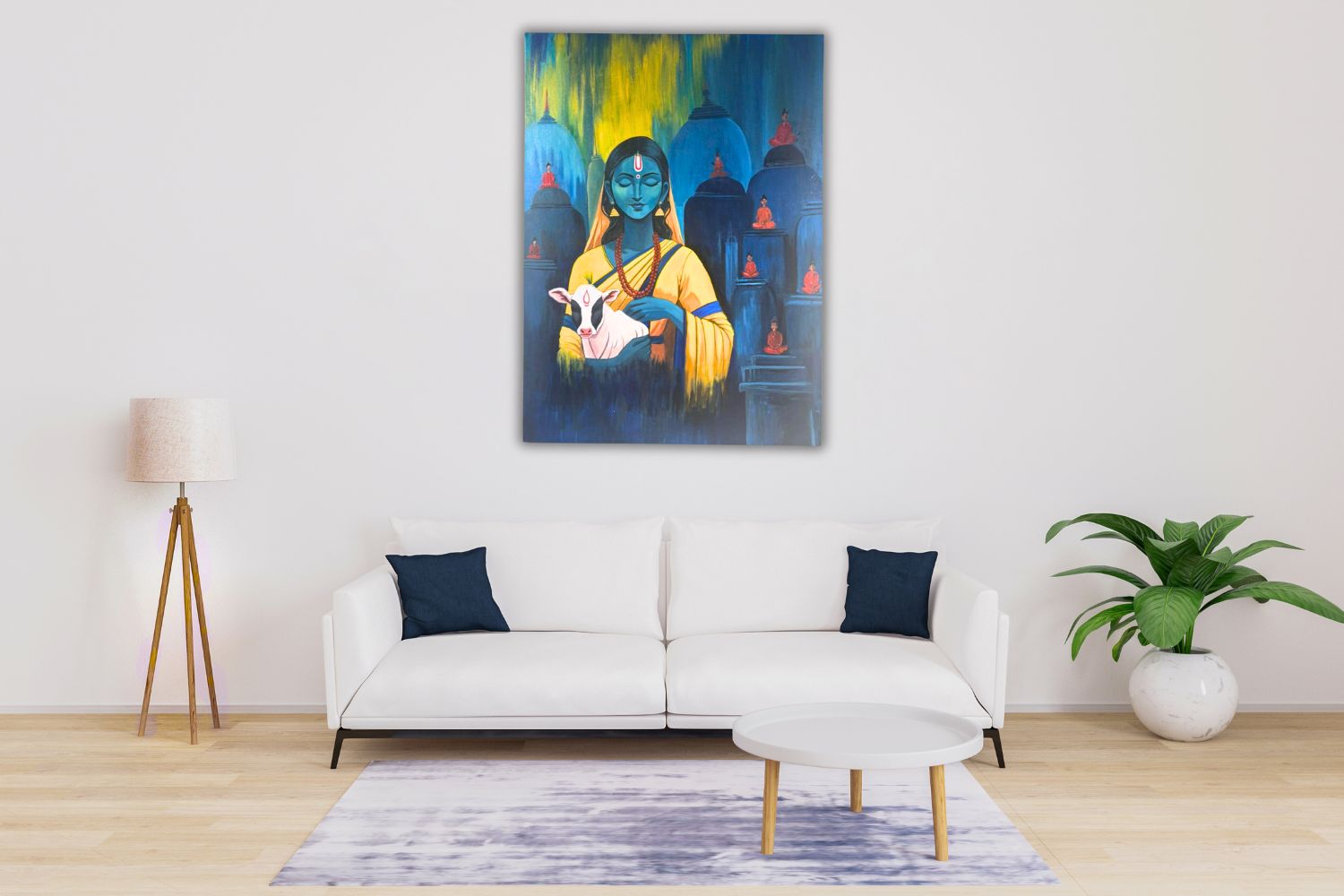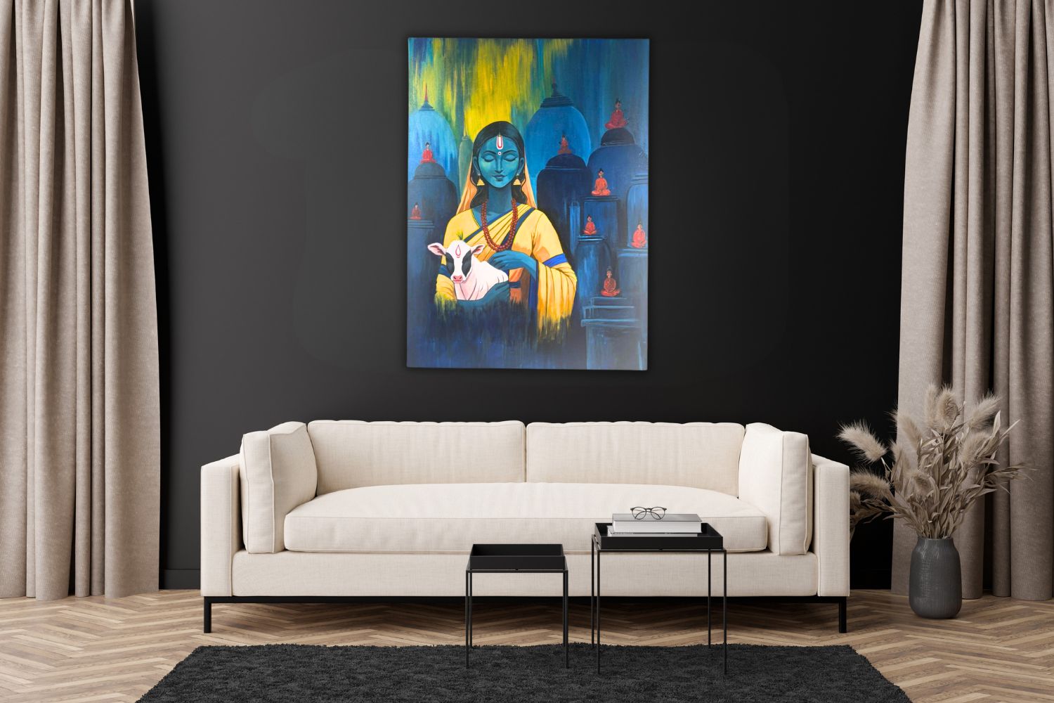 This artwork portrays a serene sadhvi draped in yellow, standing against a tranquil blue backdrop. She gently holds a calf, radiating tenderness and purity. The presence of monks in the background adds depth, symbolizing discipline, devotion, and the timeless bond between spirituality and nature. A soulful blend of compassion and divinity captured beautifully in acrylic on canvas.