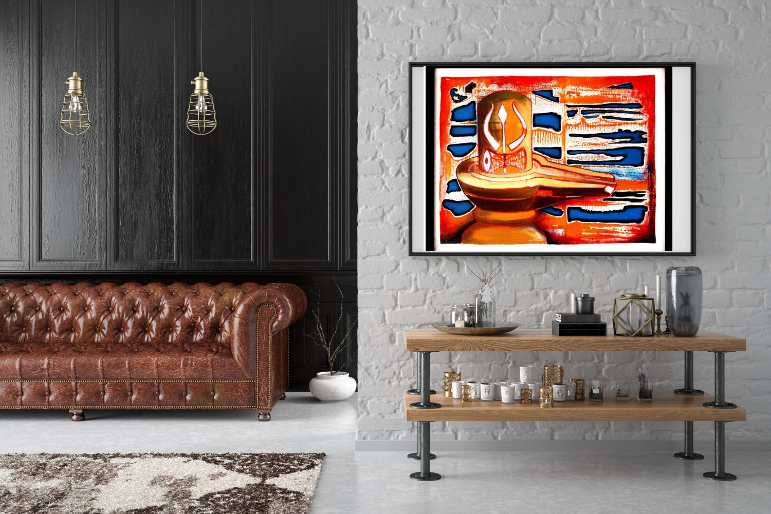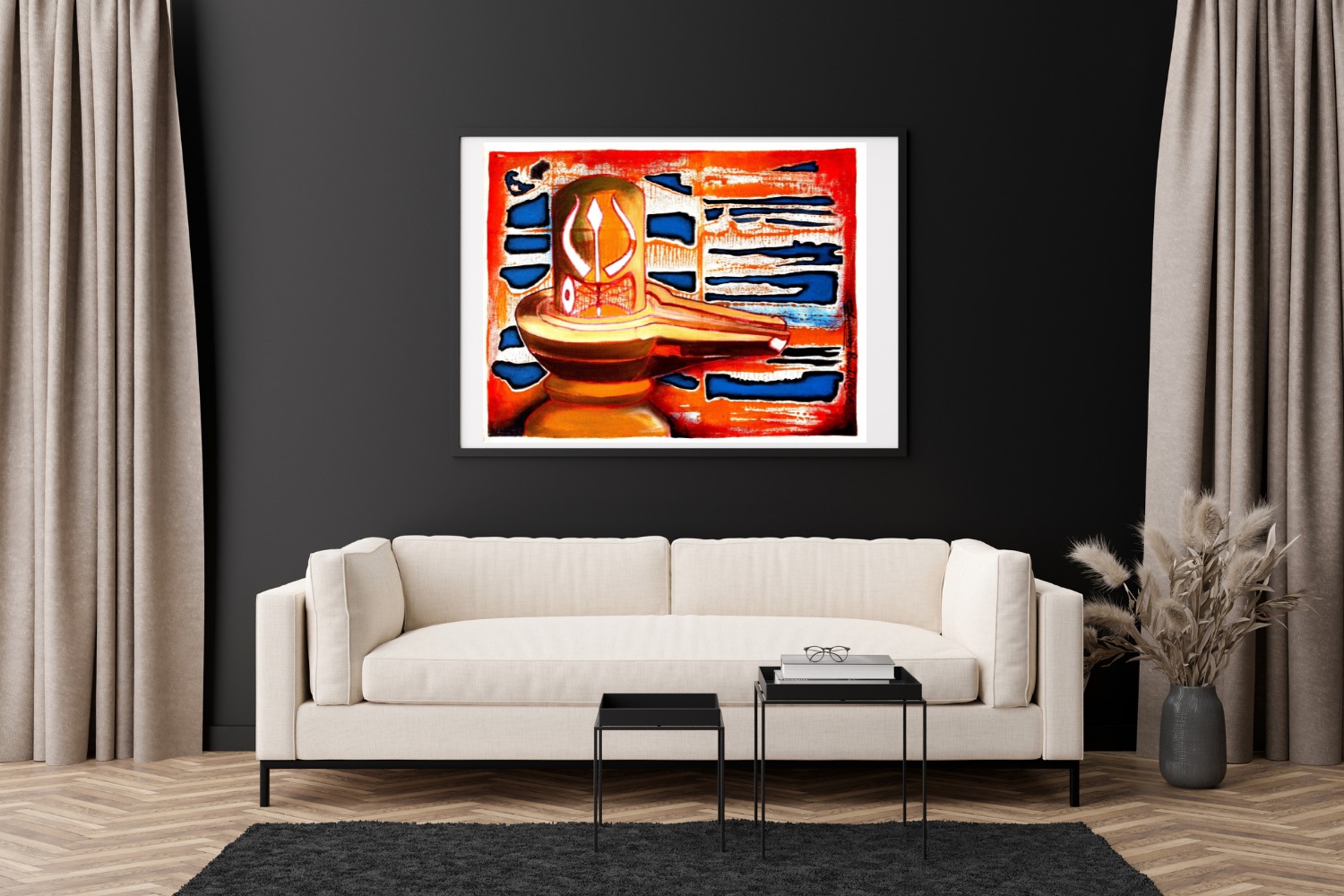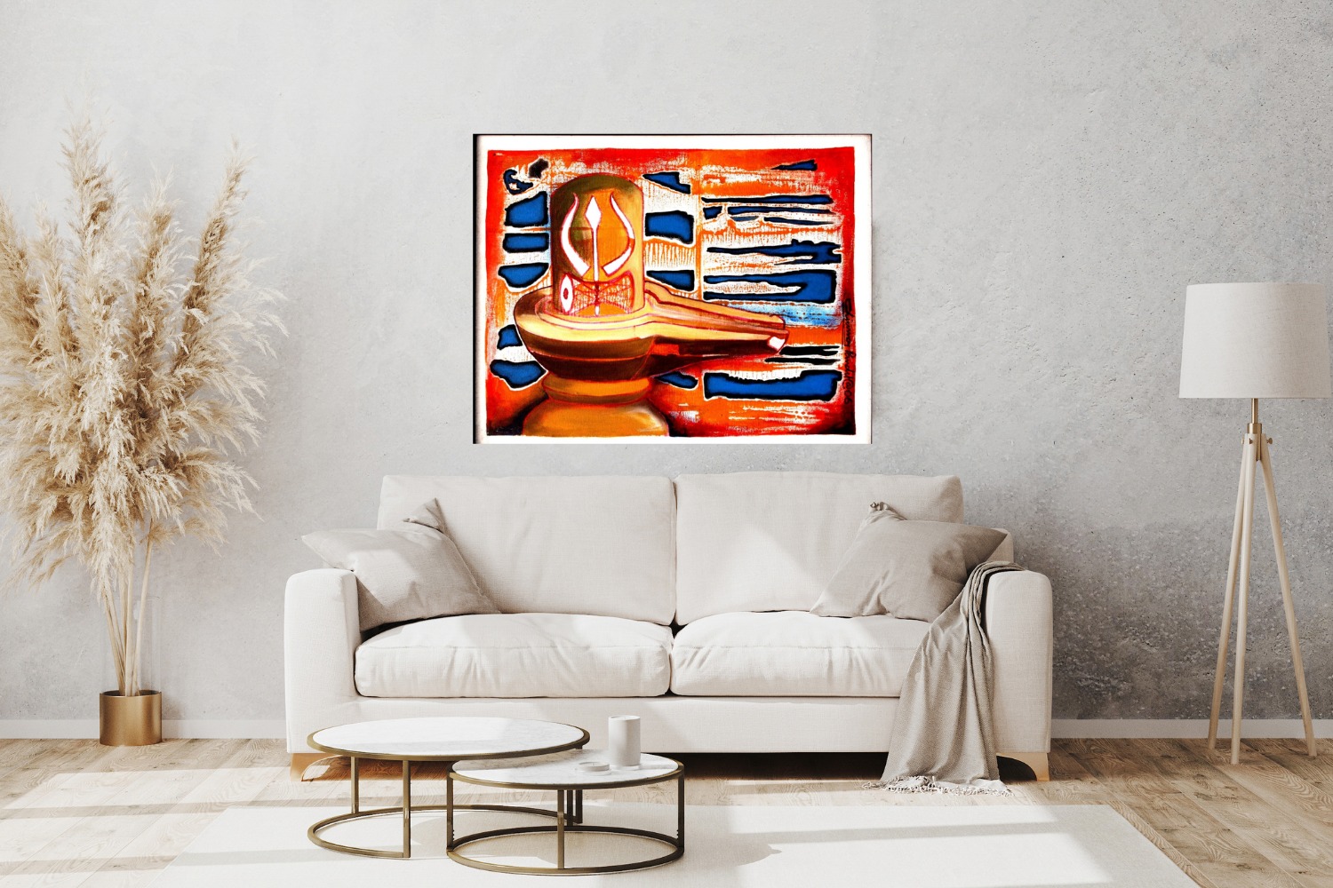 Shiva Linga is a powerful acrylic painting on canvas depicting the sacred Shiva Linga, symbolizing creation, energy, and cosmic balance. The artwork radiates divine strength through vibrant shades of orange, gold, and blue, representing fire, purity, and infinity. Bold strokes and a textured background evoke spiritual depth and transcendence, while the luminous aura around the Linga captures the eternal presence of Lord Shiva.