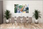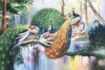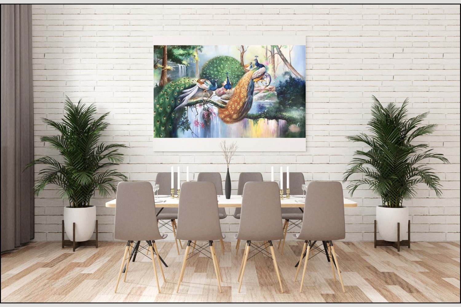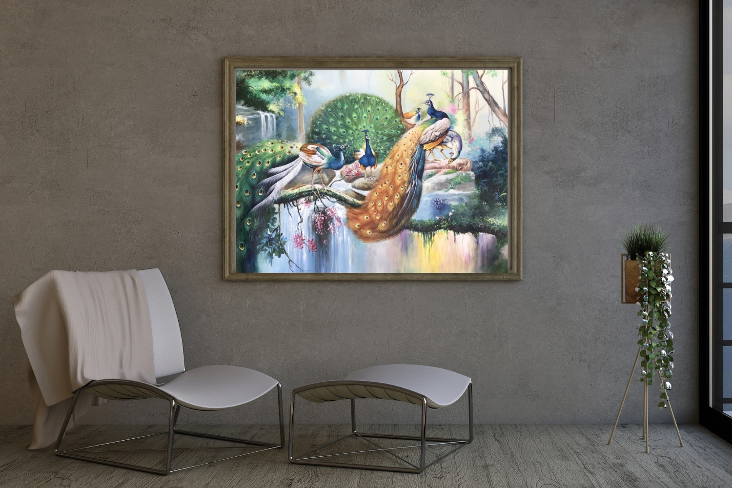 Symphony of Peacocks is a 59 × 35 in original acrylic painting featuring vibrant peacocks in a serene forest. Large-scale, detailed, and framed available on request, it brings grace, color, and harmony to any space.